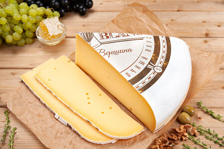 Состав: пастеризованное молоко, соль (содержит агент антислеживающий - ферроцианид калия), уплотнитель - хлорид кальция, консервант - нитрат натрия, ферментный препарат животного происхождения - лизоцим (белок куриных яиц), комплексная пищевая добавка (регулятор кислотности - гидроксид натрия, краситель - норбиксин), закваска мезофильно-термофильных молочных бактерий, ферментные препараты животного происхождения: химозин, пепсин. Массовая доля жира в сухом веществе - 50±1,6%. Пищевая ценность на 100 гр. продукта: белки - 23,5г.; жиры - 29,0г. Энергетическая ценность: 355,0 ккал/1473,0 кДж Срок годности: 210 суток при температуре от 0 до +4°С и относительной влажности воздуха не выше 85%.
