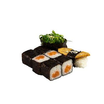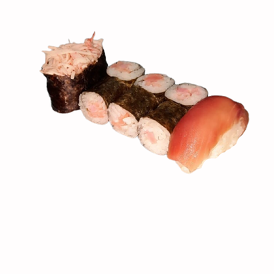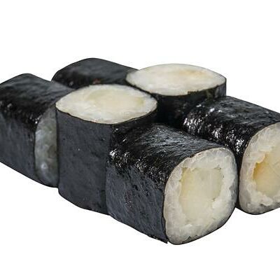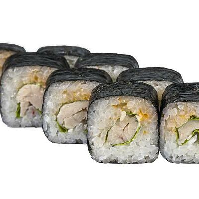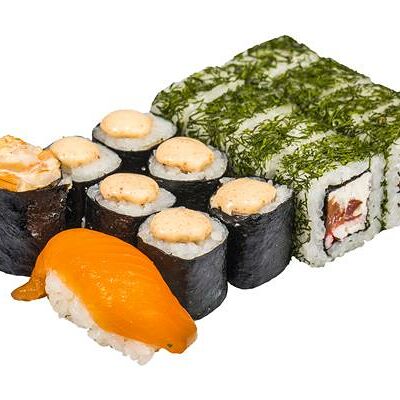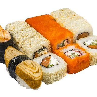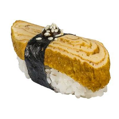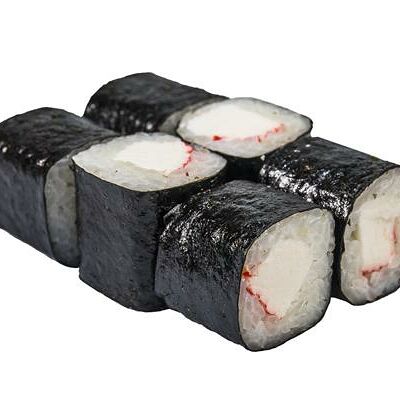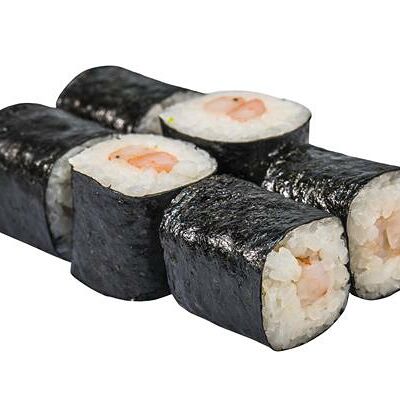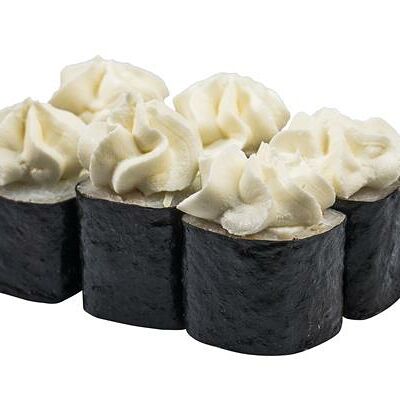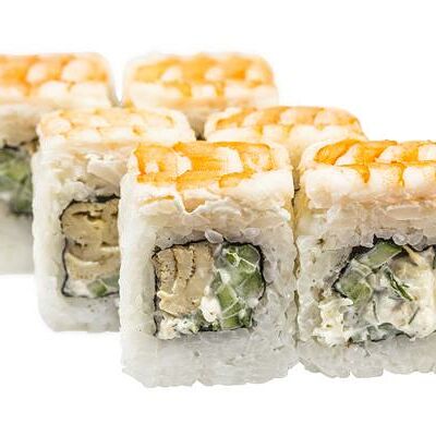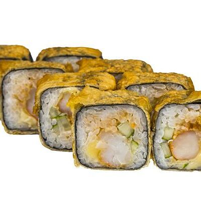 Рис, нори, белый соус, омлет тамаго, огурец, сыр мягкий, креветка