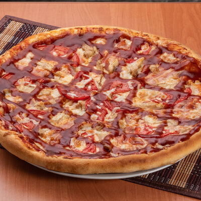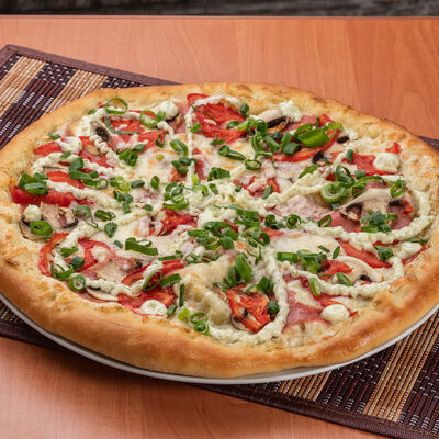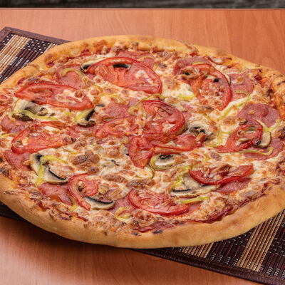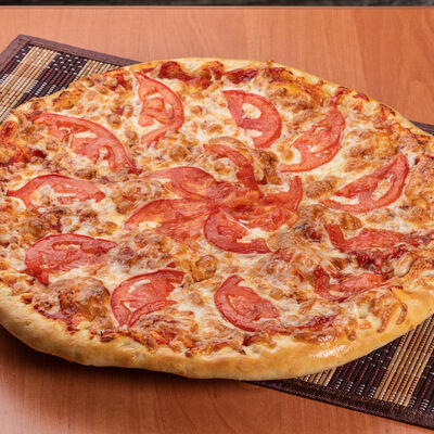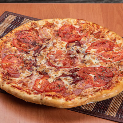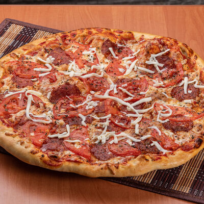 Тонкое тесто, пикантная колбаса чоризо, свежие томаты, сыр моцарелла, томатный соус (33 см)