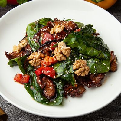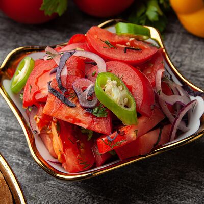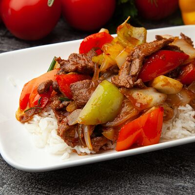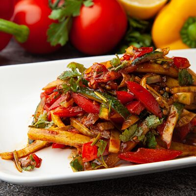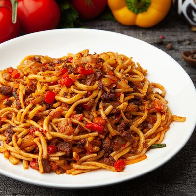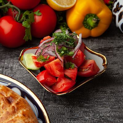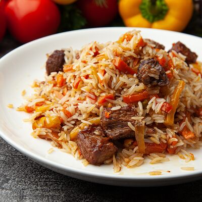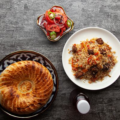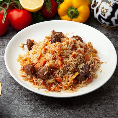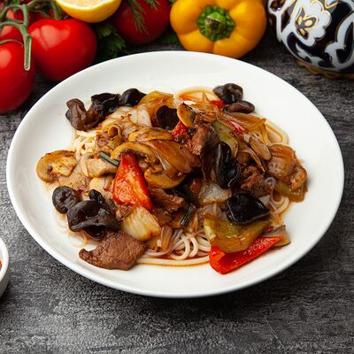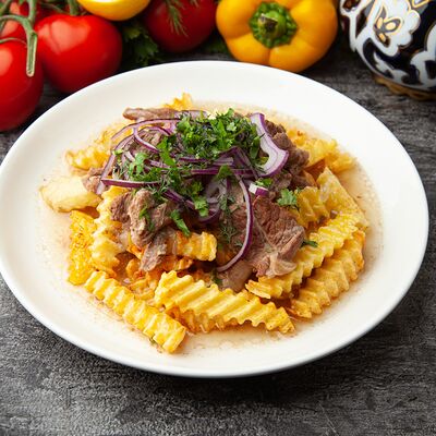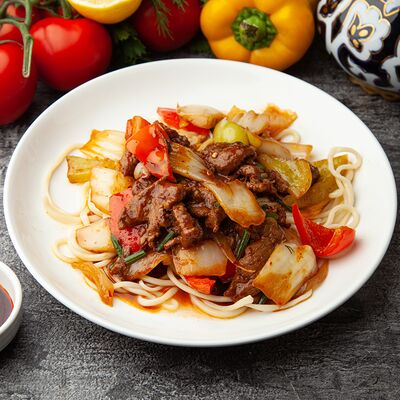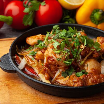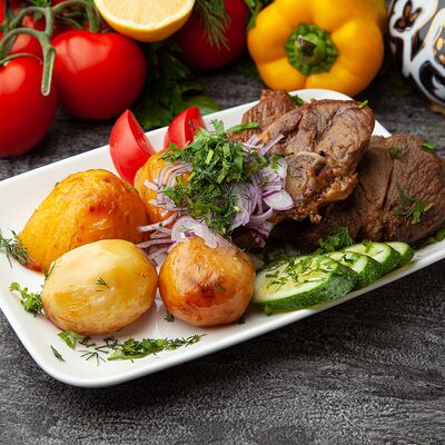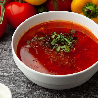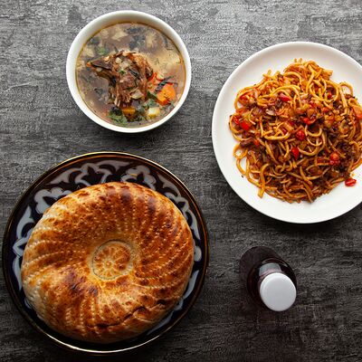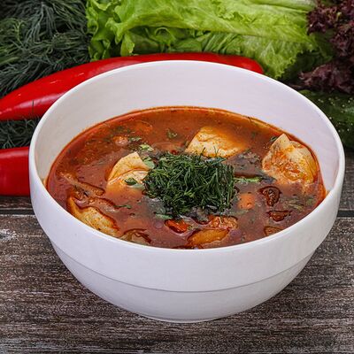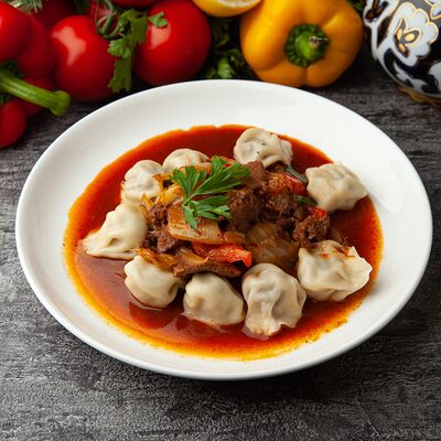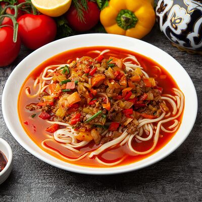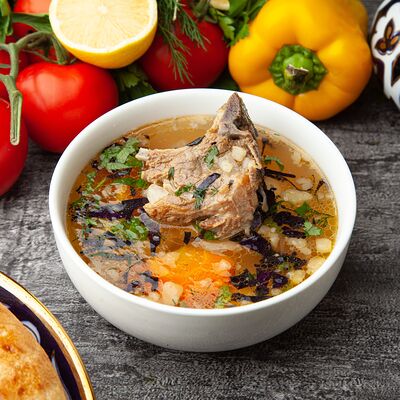 Наваристый ароматный бульон с бараниной и крупно нарезанными картофелем, болгарским перцем, красной морковью и луком. Подается с зеленью кинзы