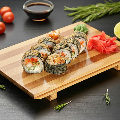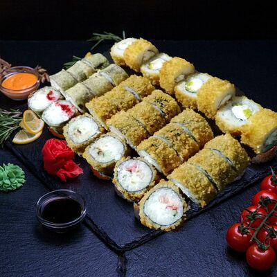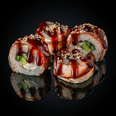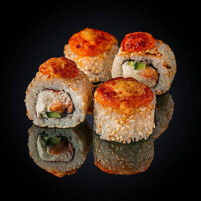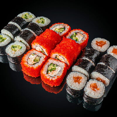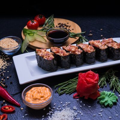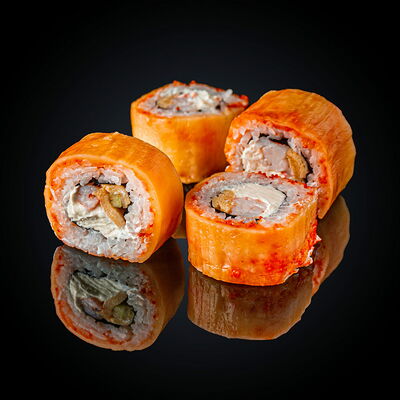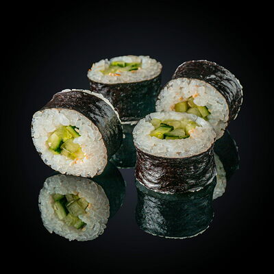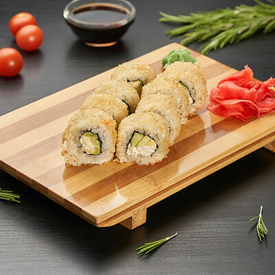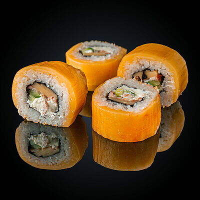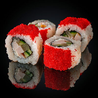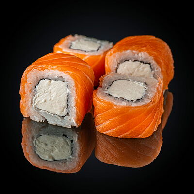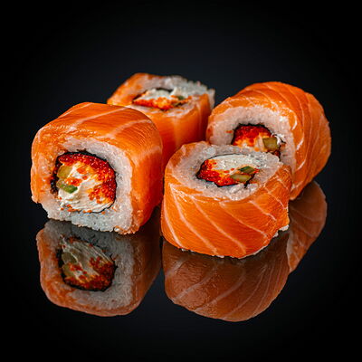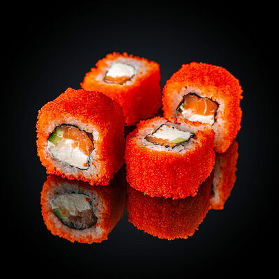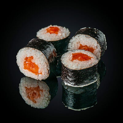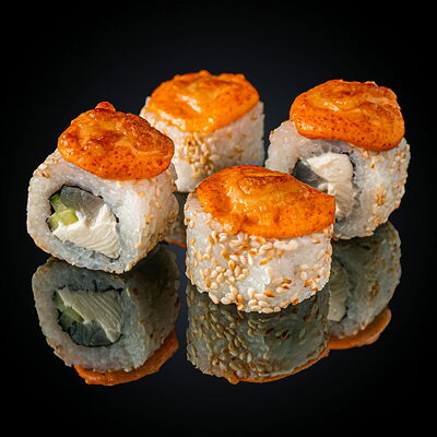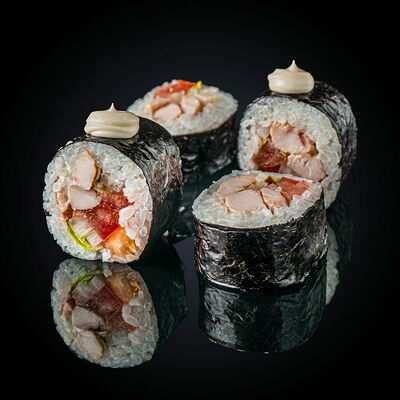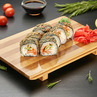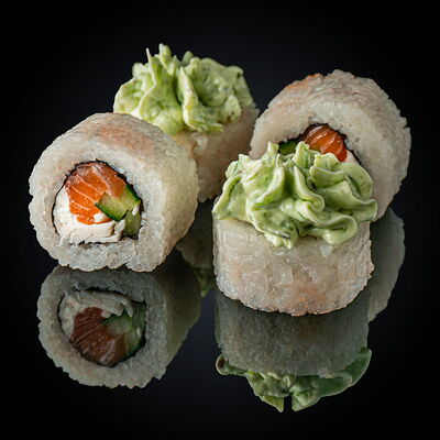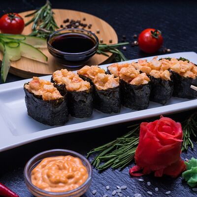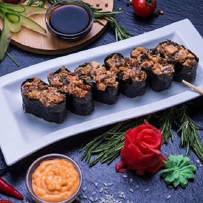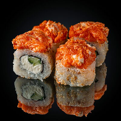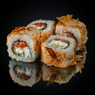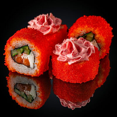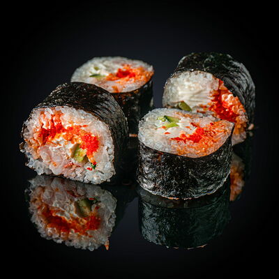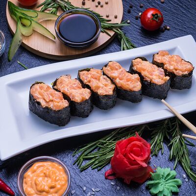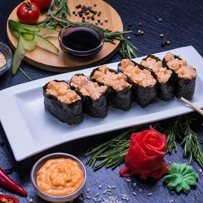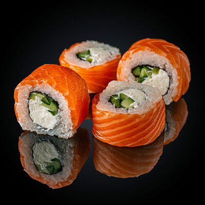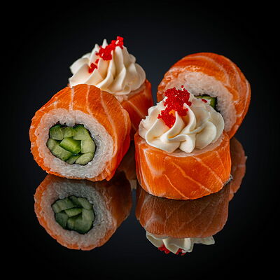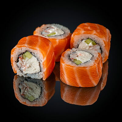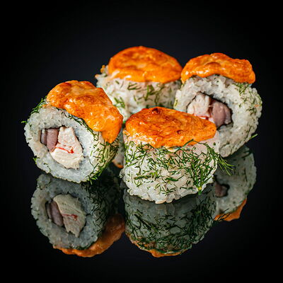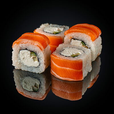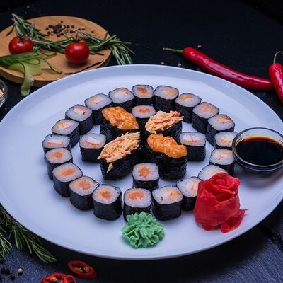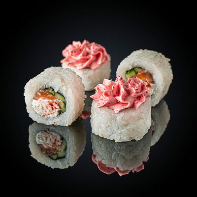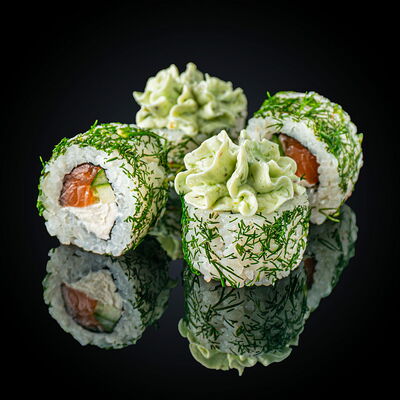 Рис, нори, сыр сливочное, огурец, лосось, укроп, соус кальмаром
