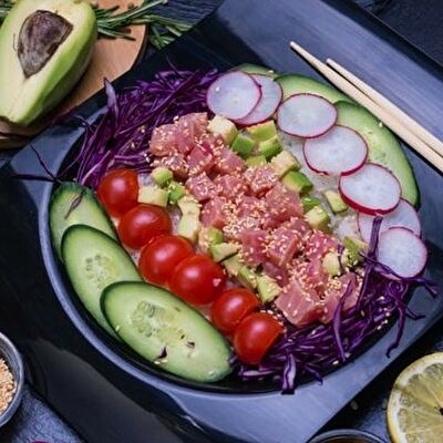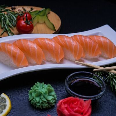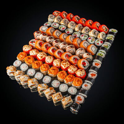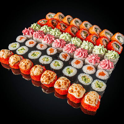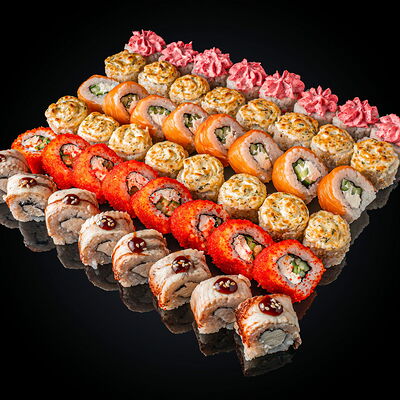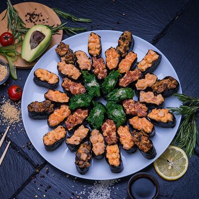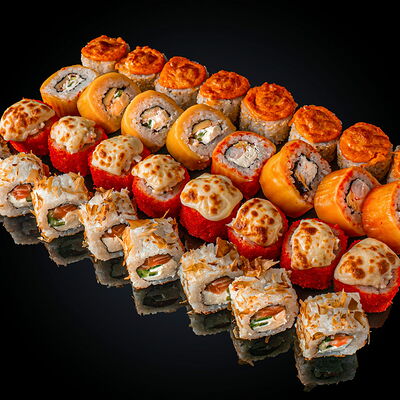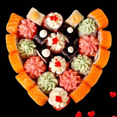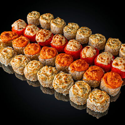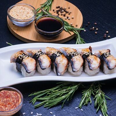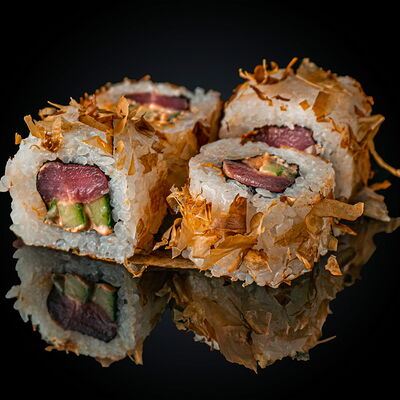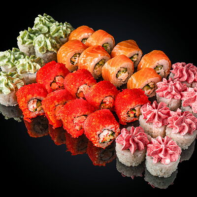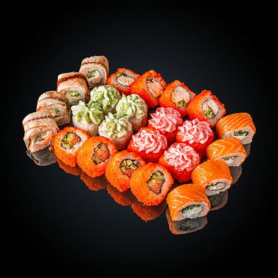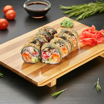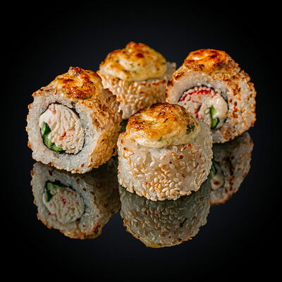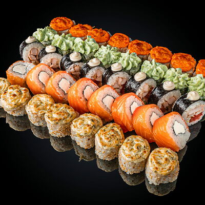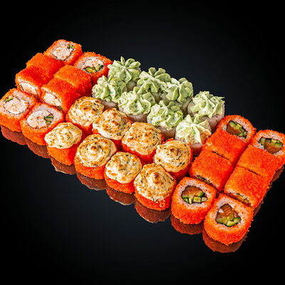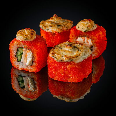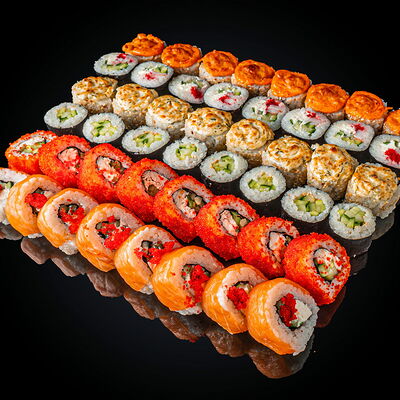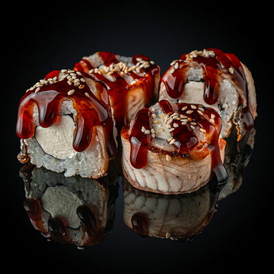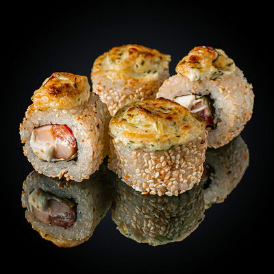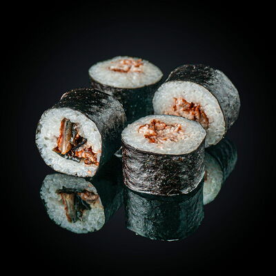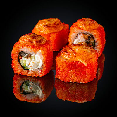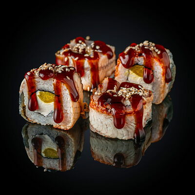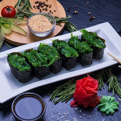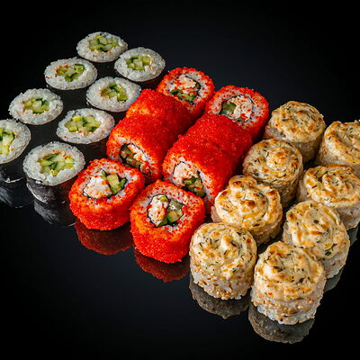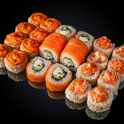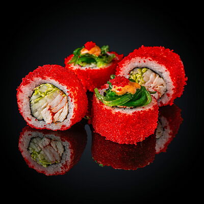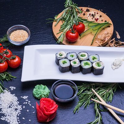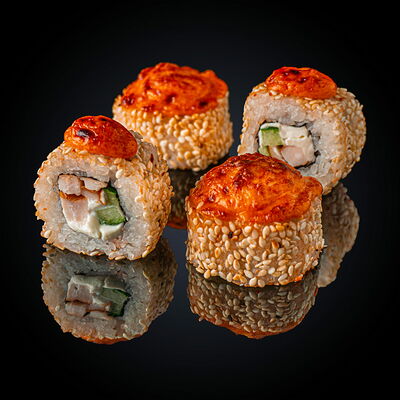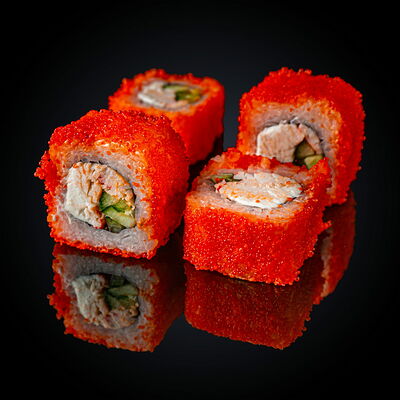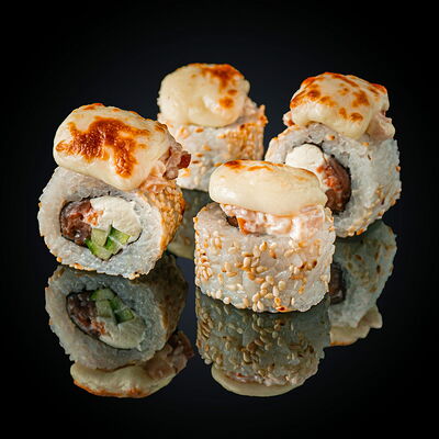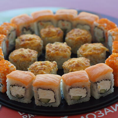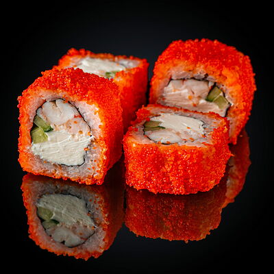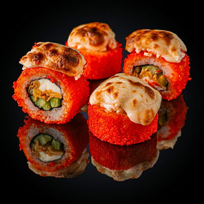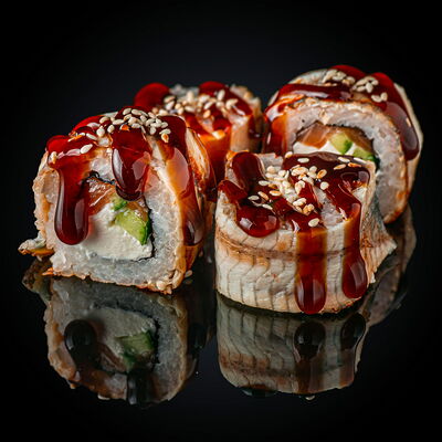 Рис, нори, сыр сливочное, огурец, лосось, укроп, соус кальмаром