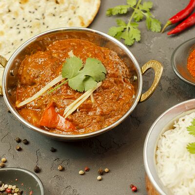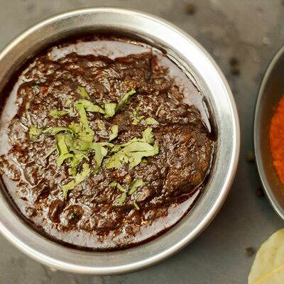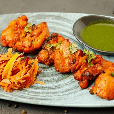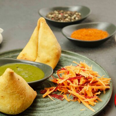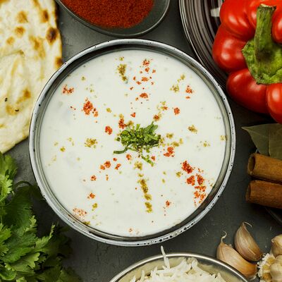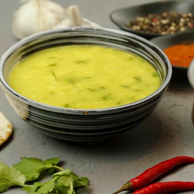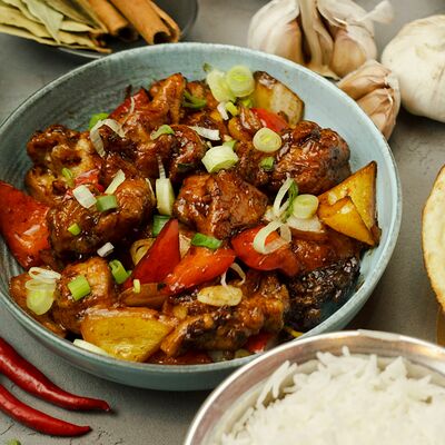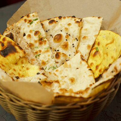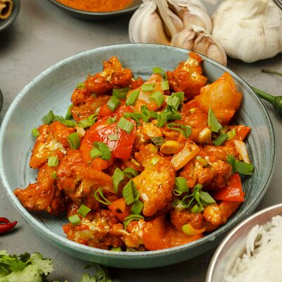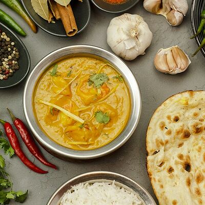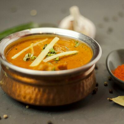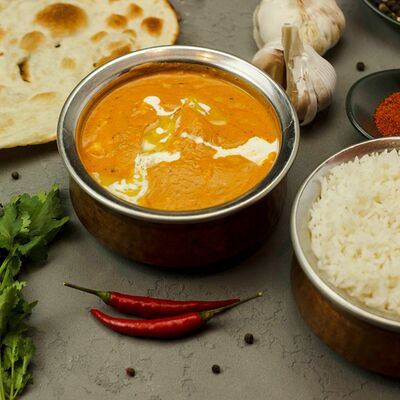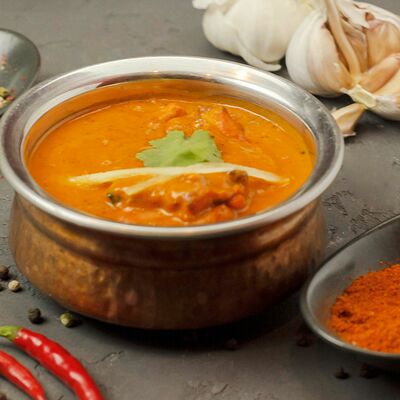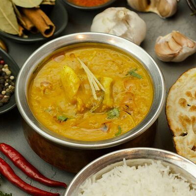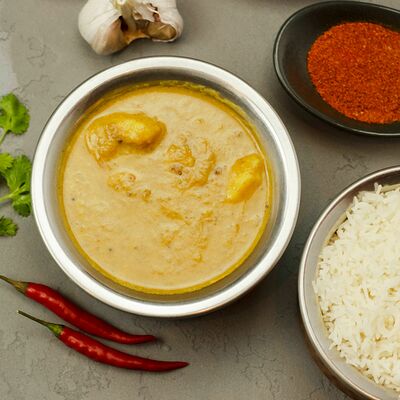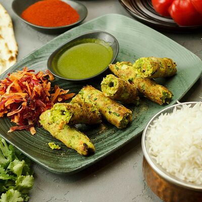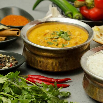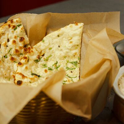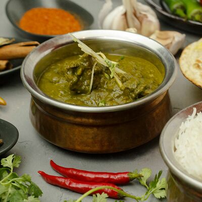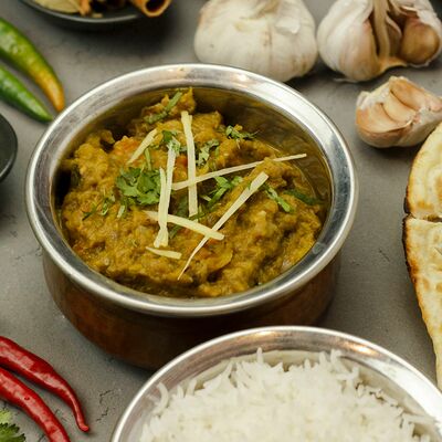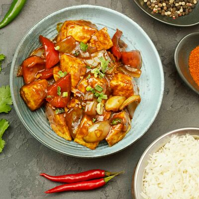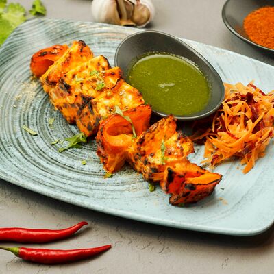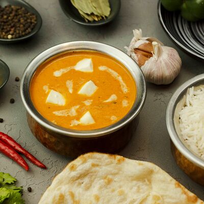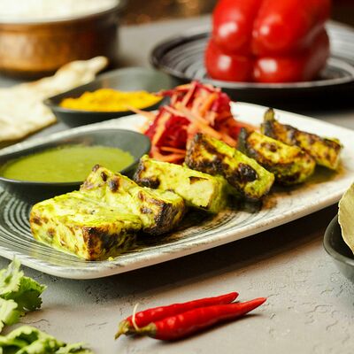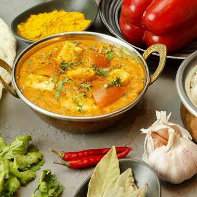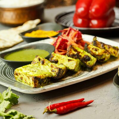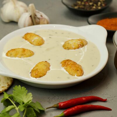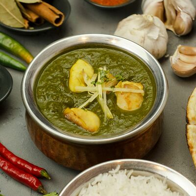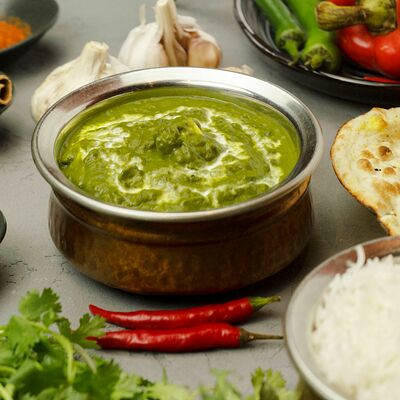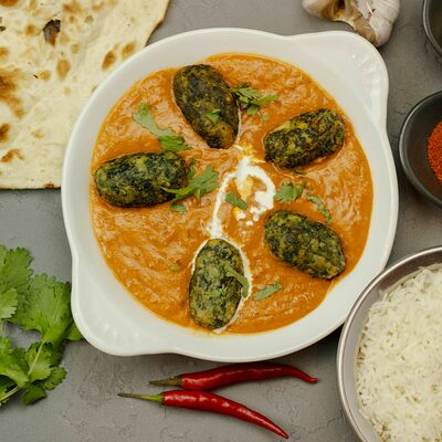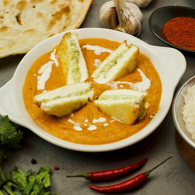 Обжаренные кубики домашнего сыра в нежном соусе из шпината, творога, лука и специй