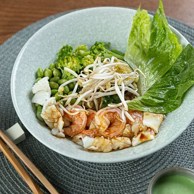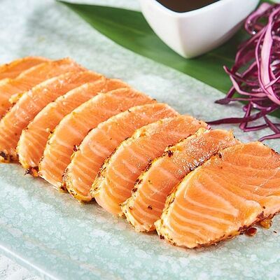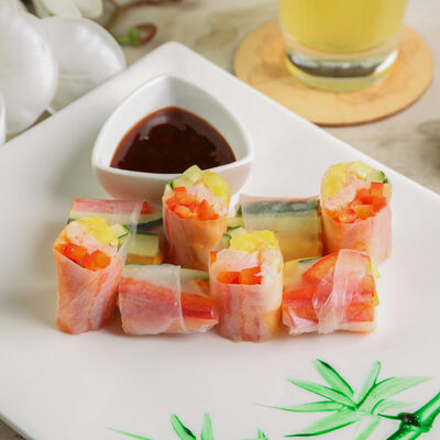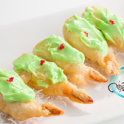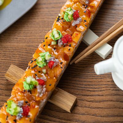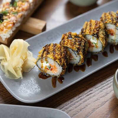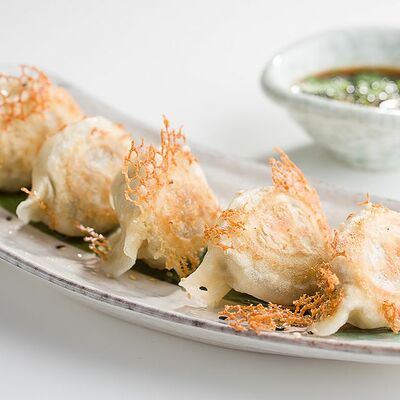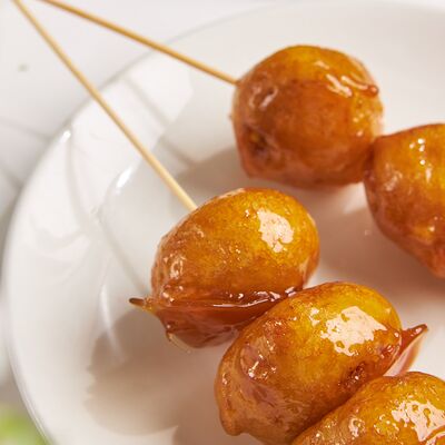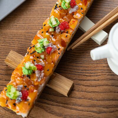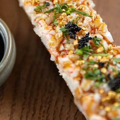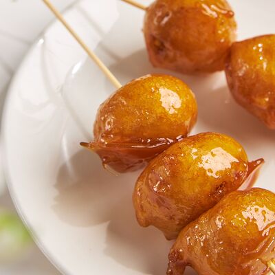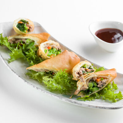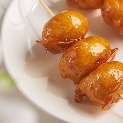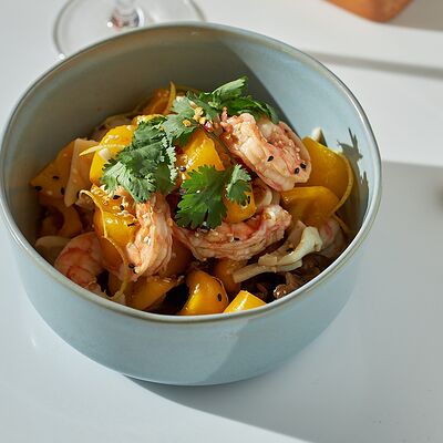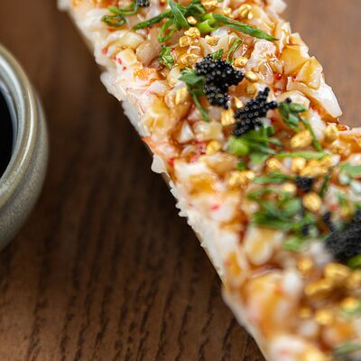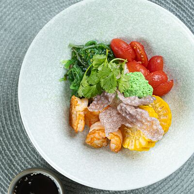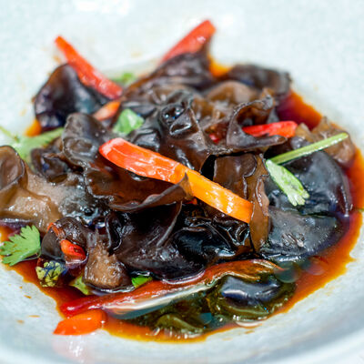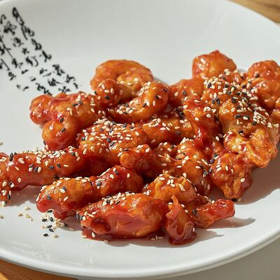 Свиные ребра, соус красный кисло-сладкий, мед, соус острый чили (4 перца), кинза, эноки жареные, масло красное
