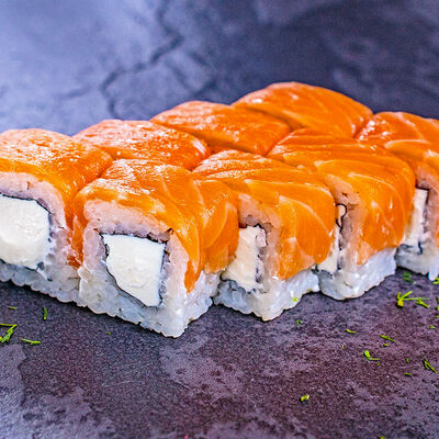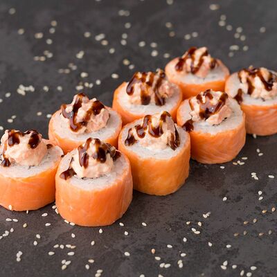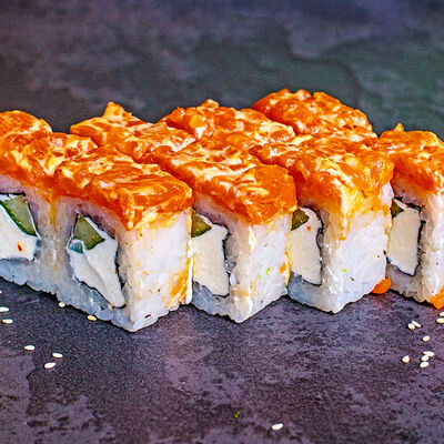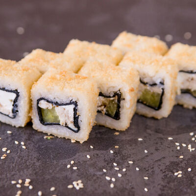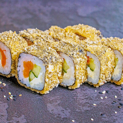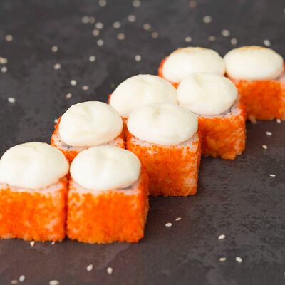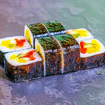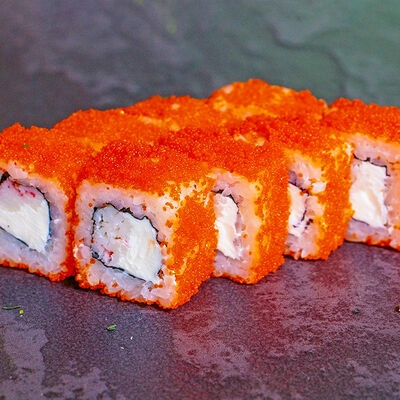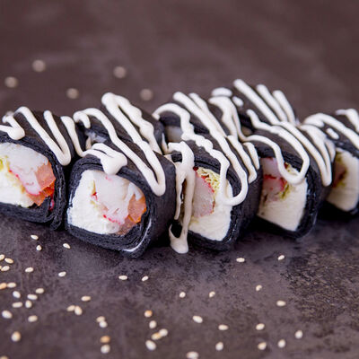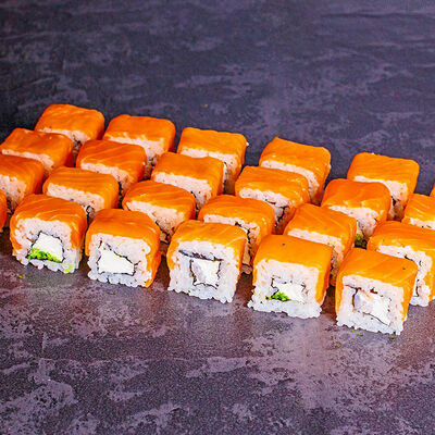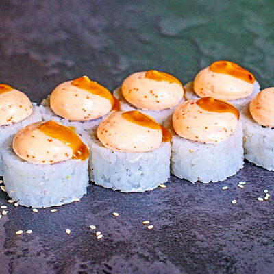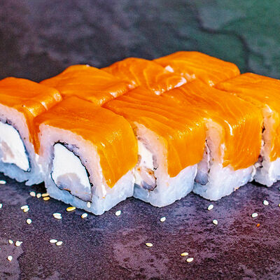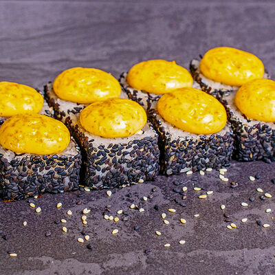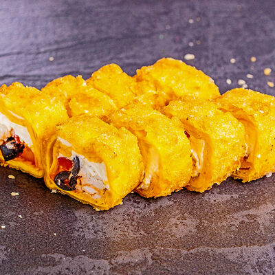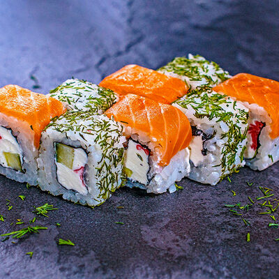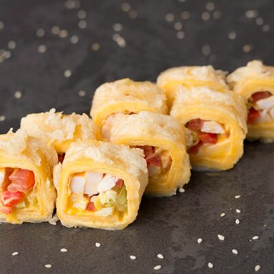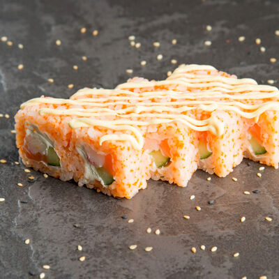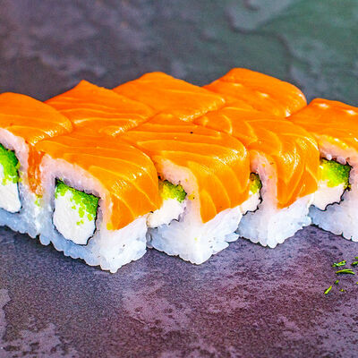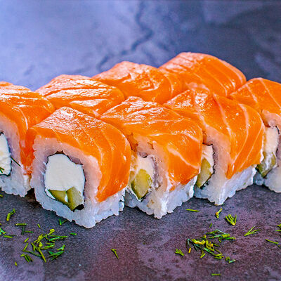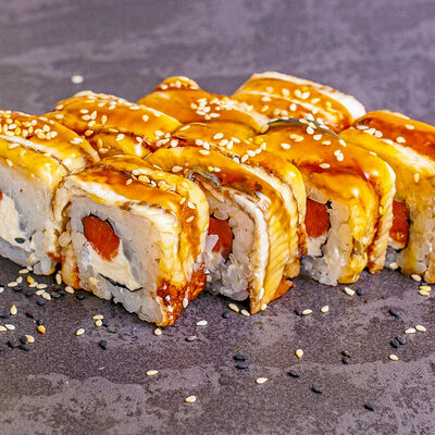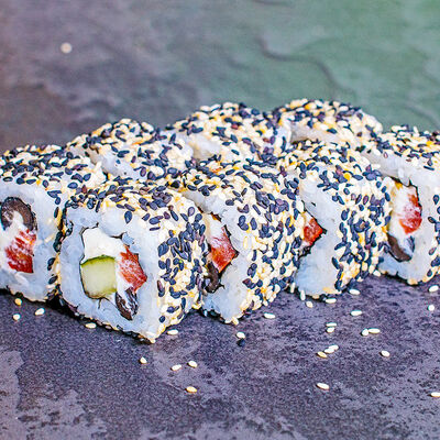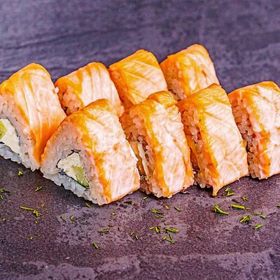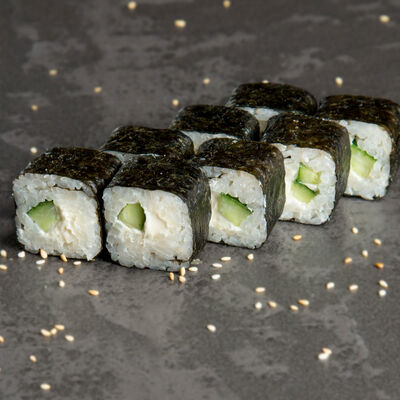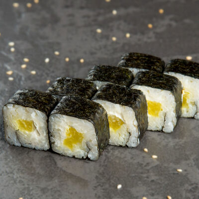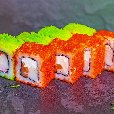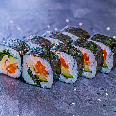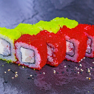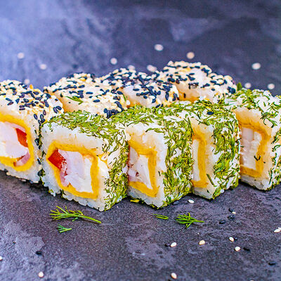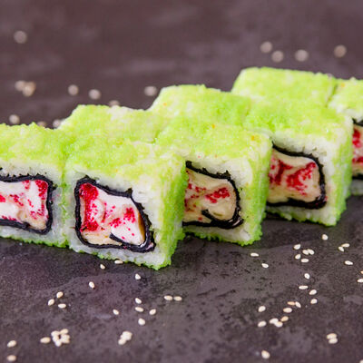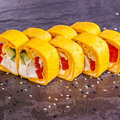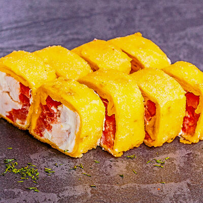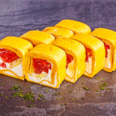 Лосось терияки, омлет тамаго, огурец, икра масаго зеленая, тортилья, сливочный сыр (8 шт.)