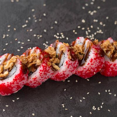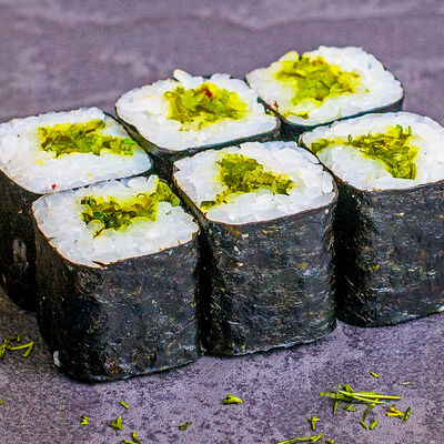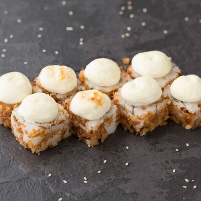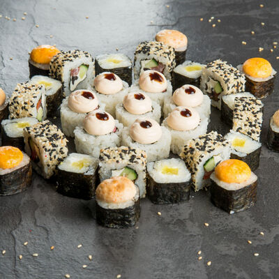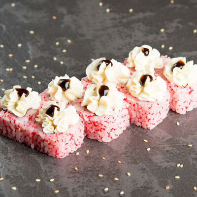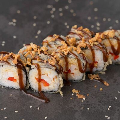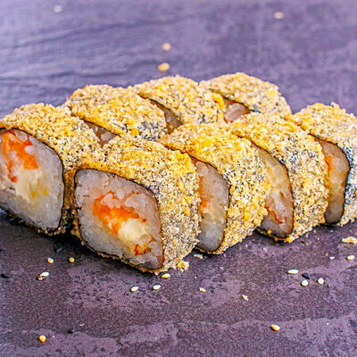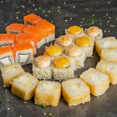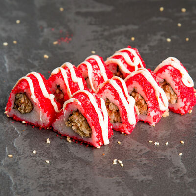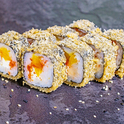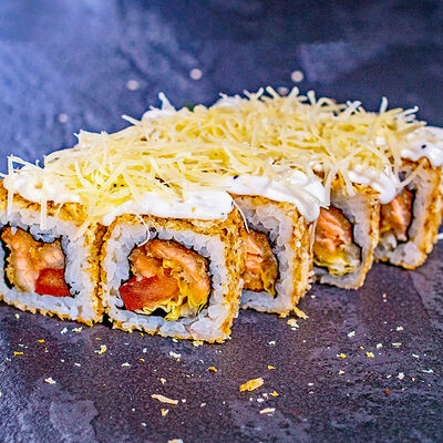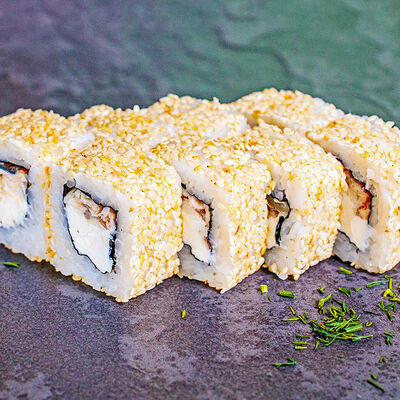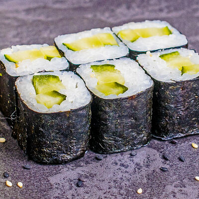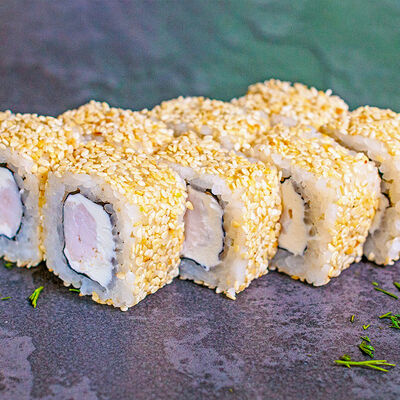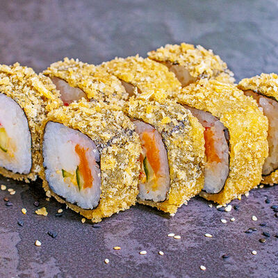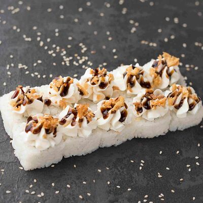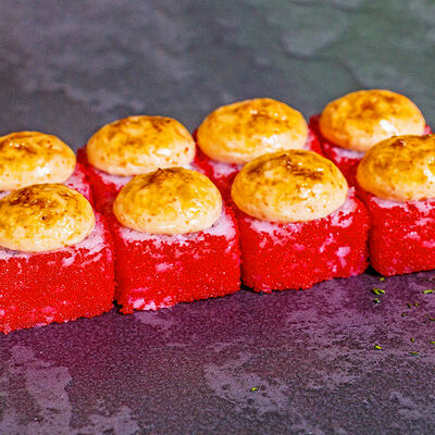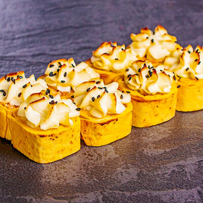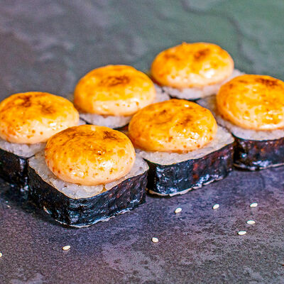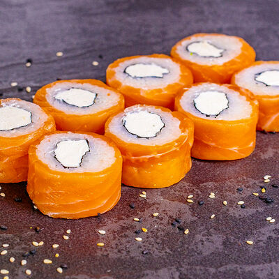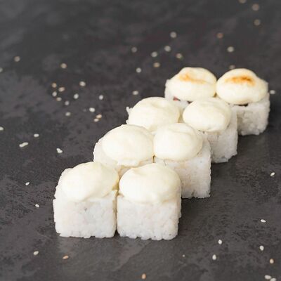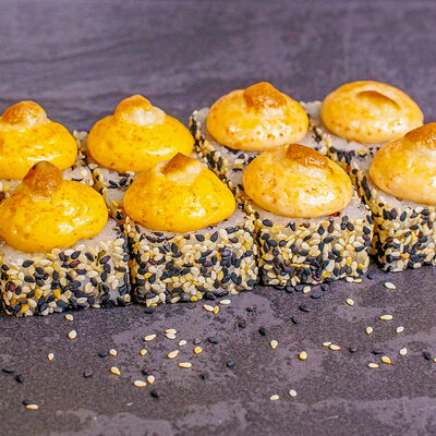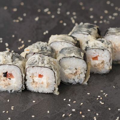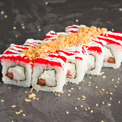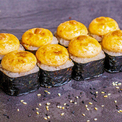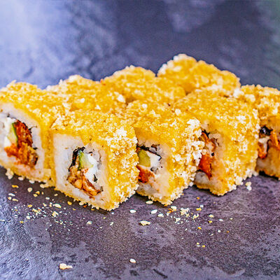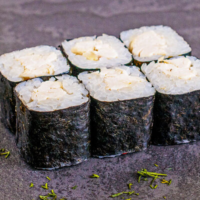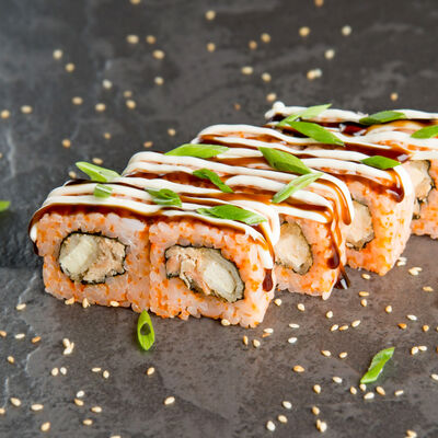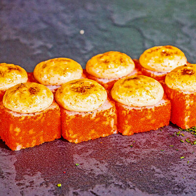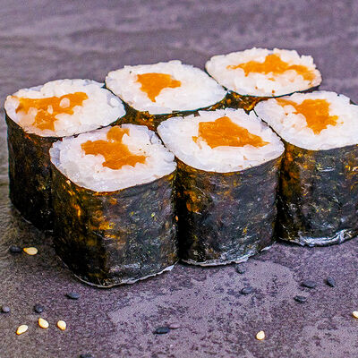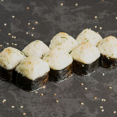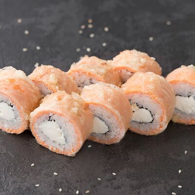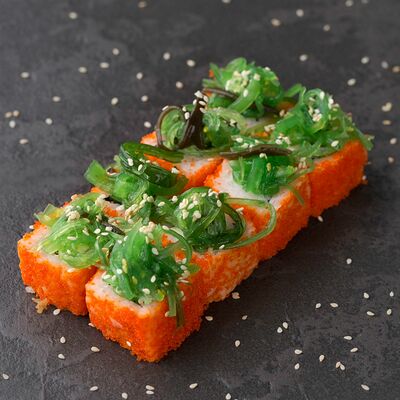 Лосось терияки, омлет тамаго, огурец, икра масаго зеленая, тортилья, сливочный сыр (8 шт.)