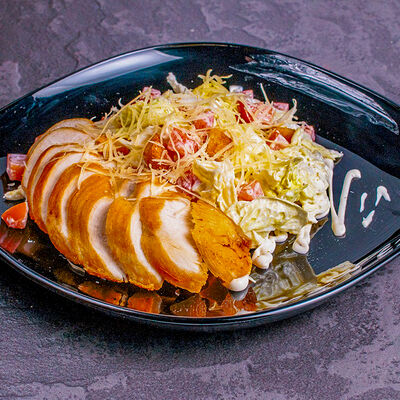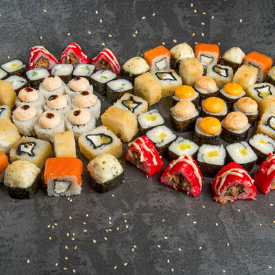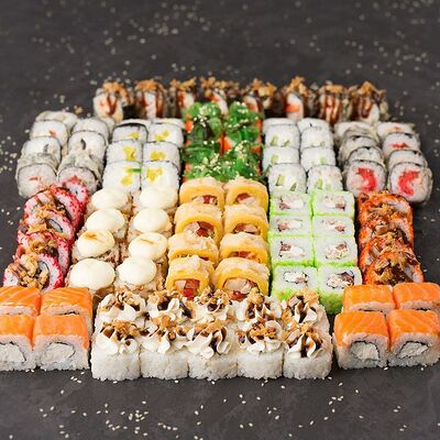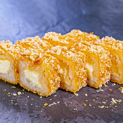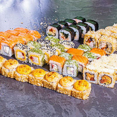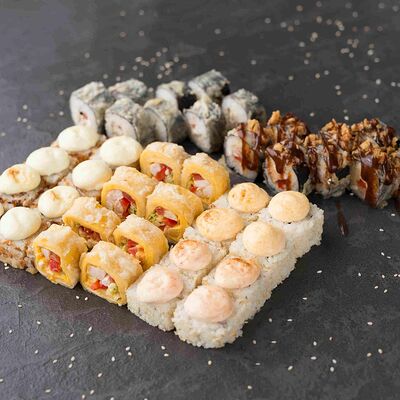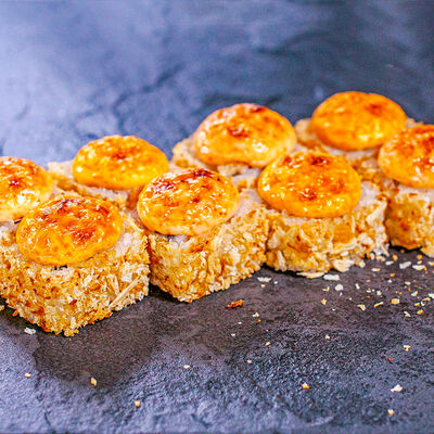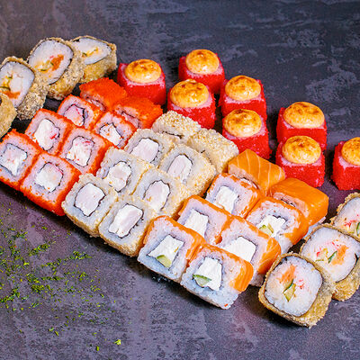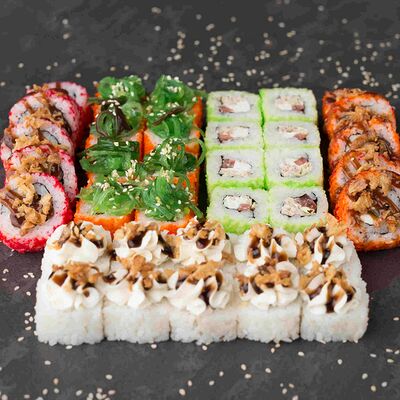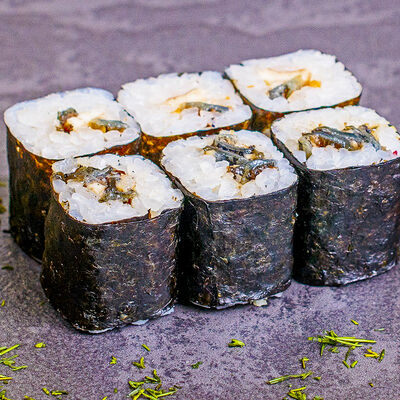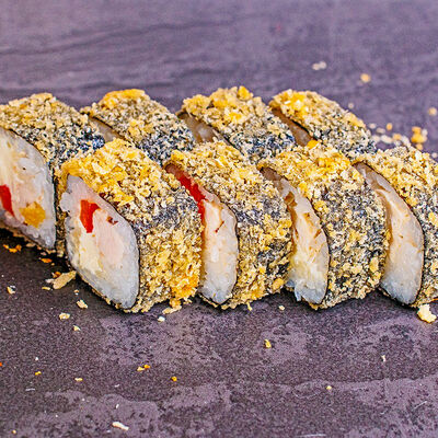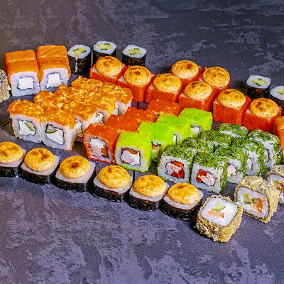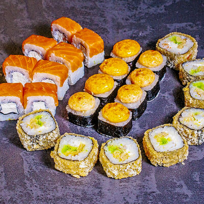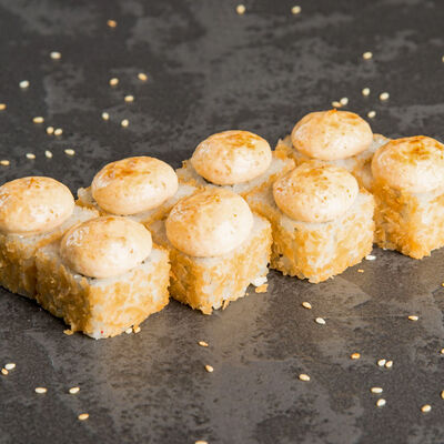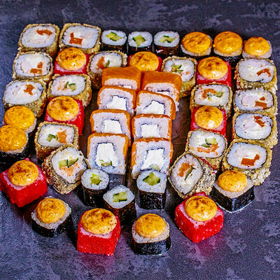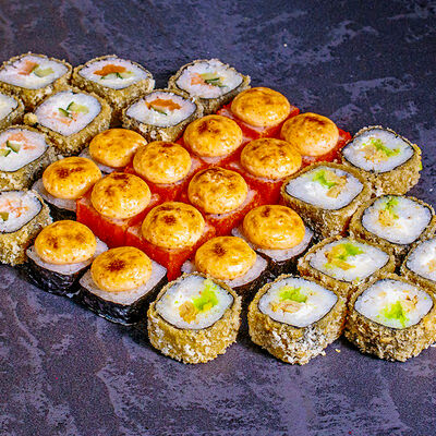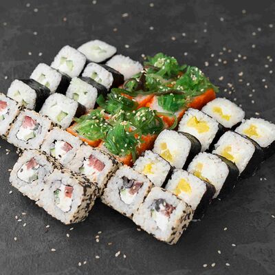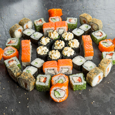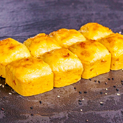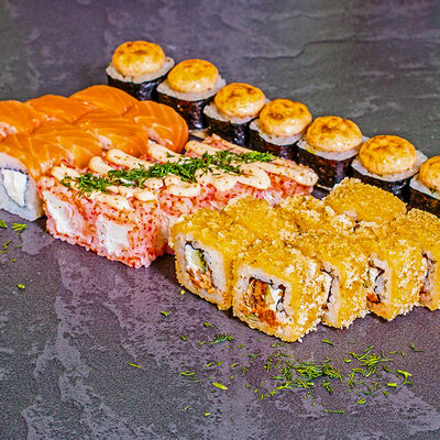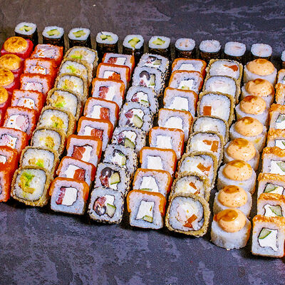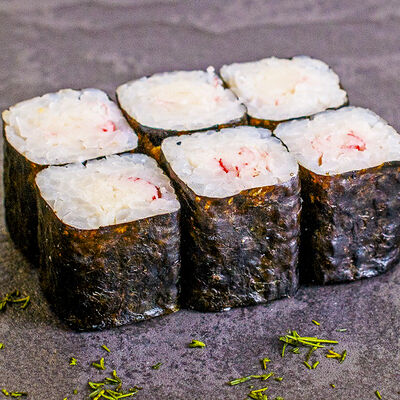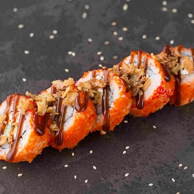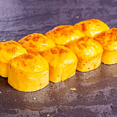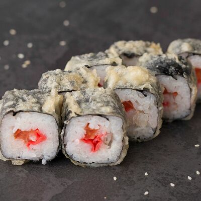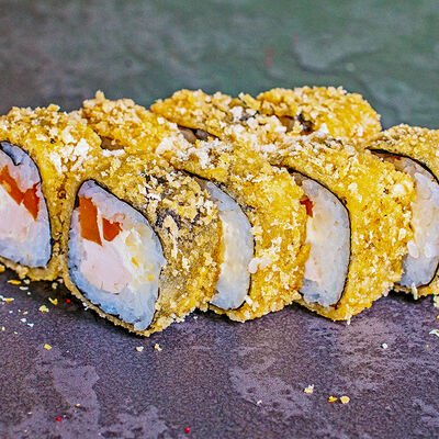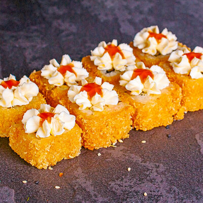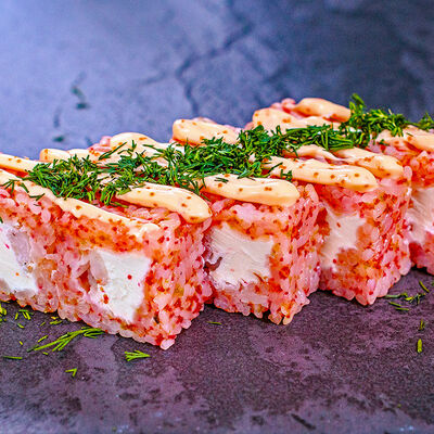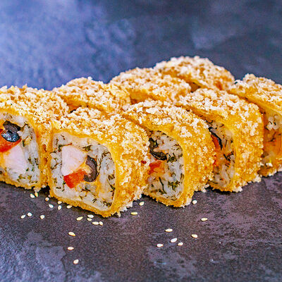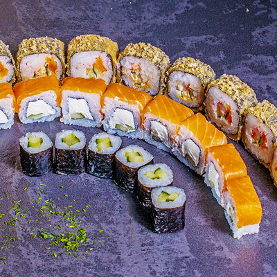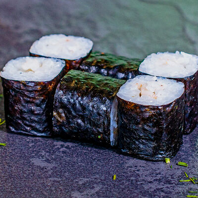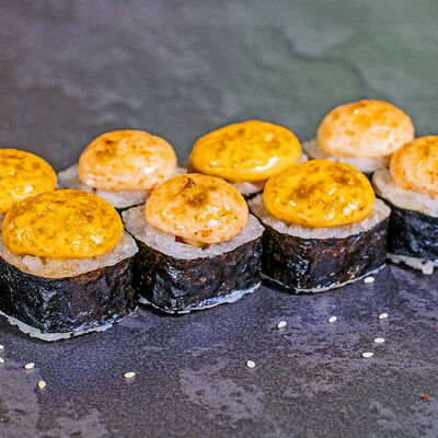 Лосось терияки, омлет тамаго, огурец, икра масаго зеленая, тортилья, сливочный сыр (8 шт.)