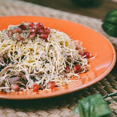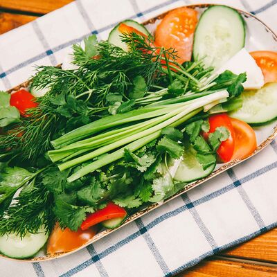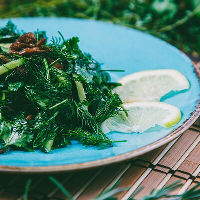 Петрушка, укроп, кинза, говядина, тушенная в соевом соусе, свежий огурец, дольки лимона