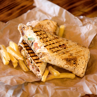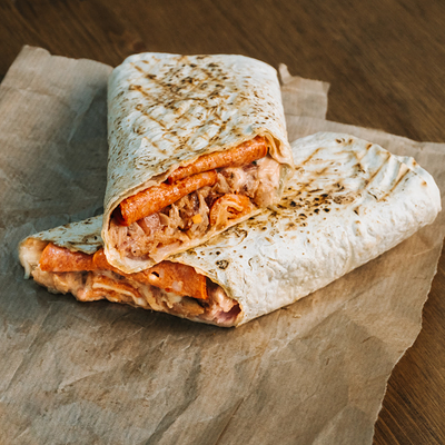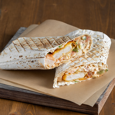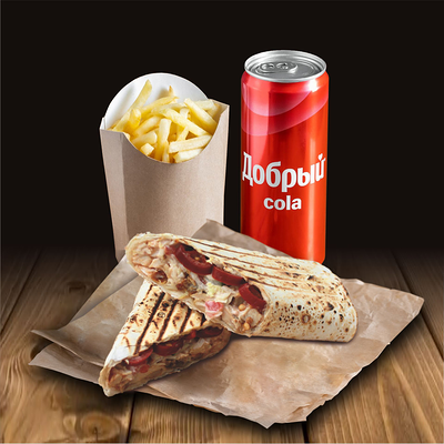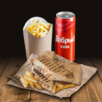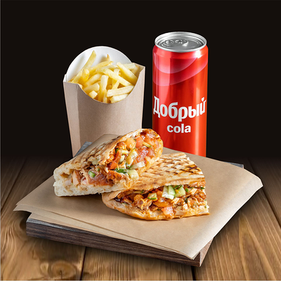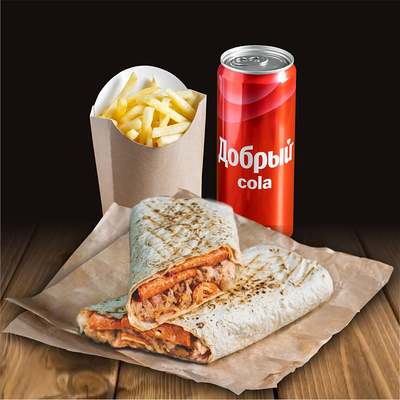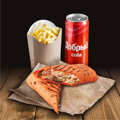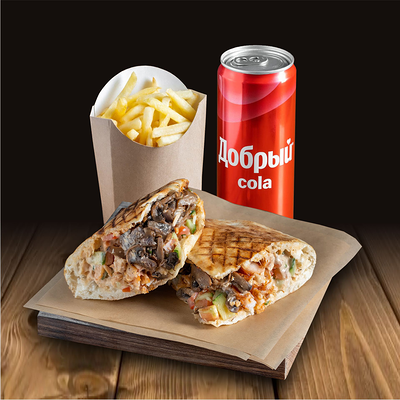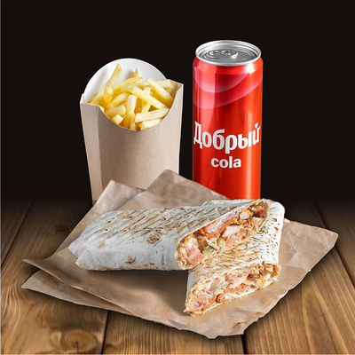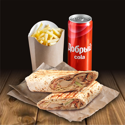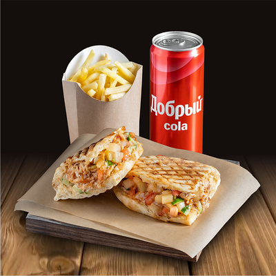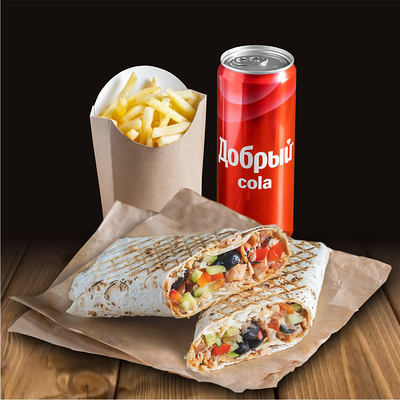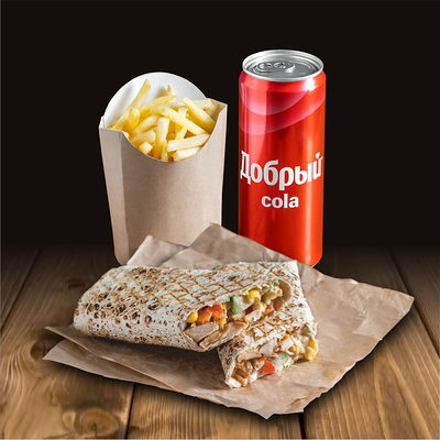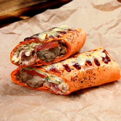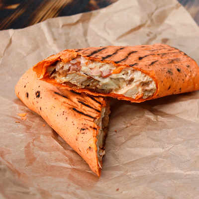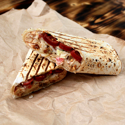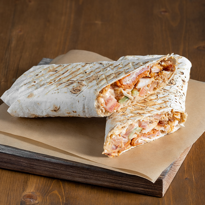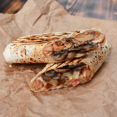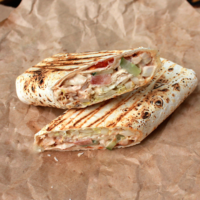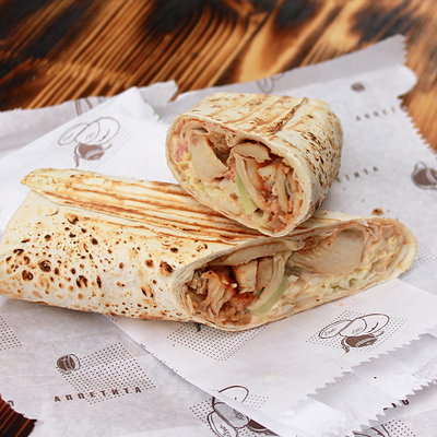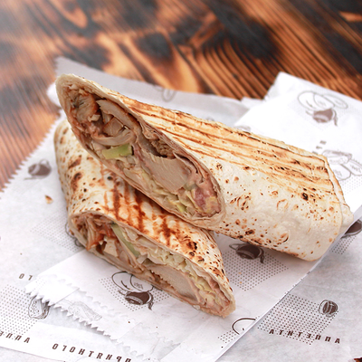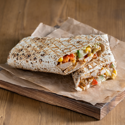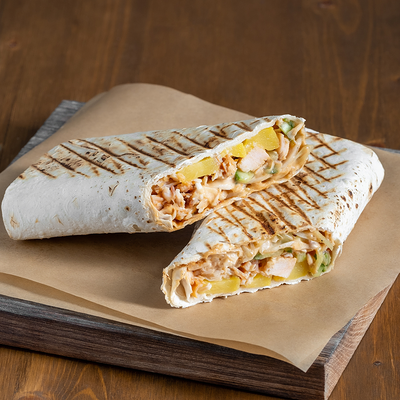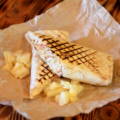 Мясо курицы, ананасы, томаты, огурцы свежие, микс салата, соус фирменный, лаваш