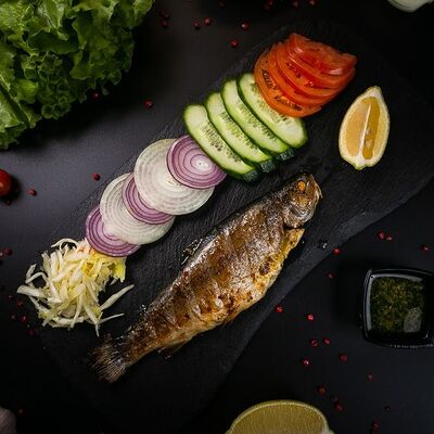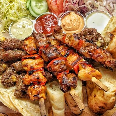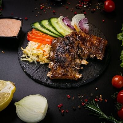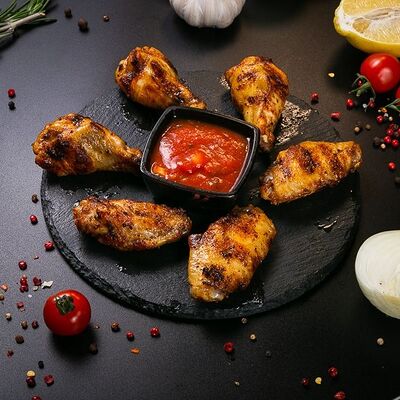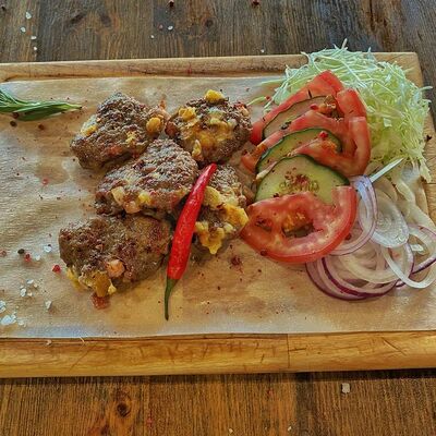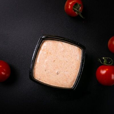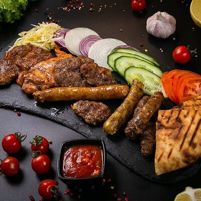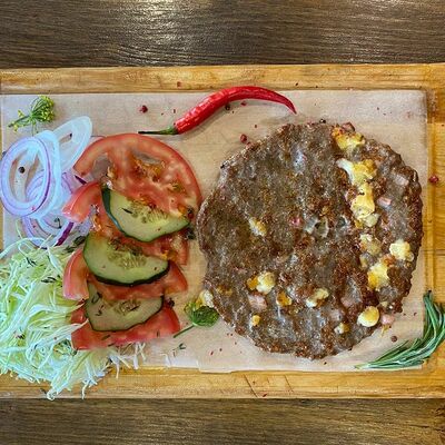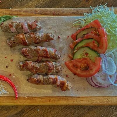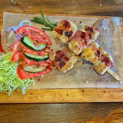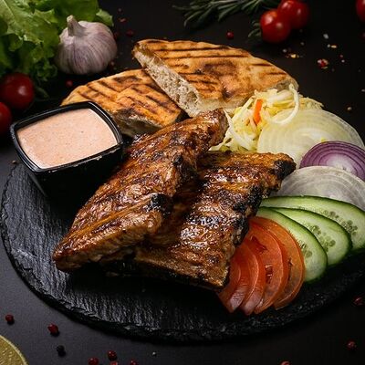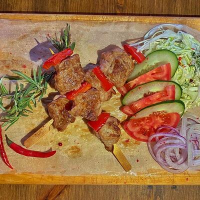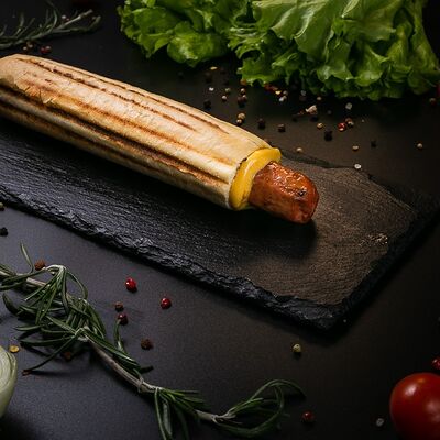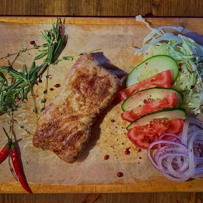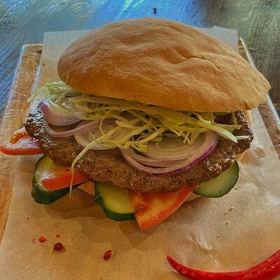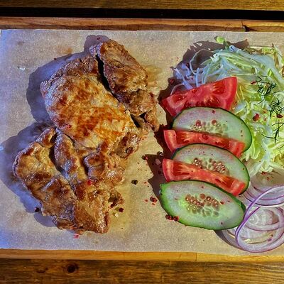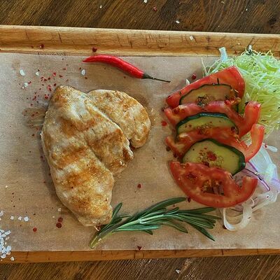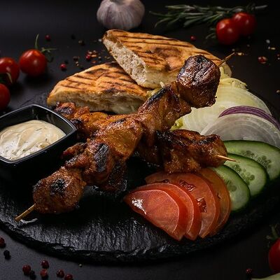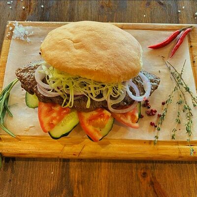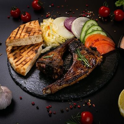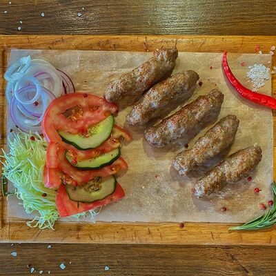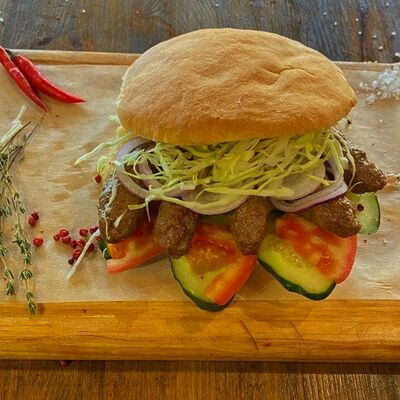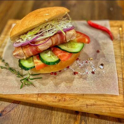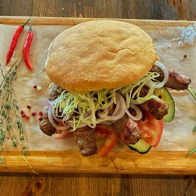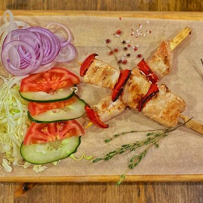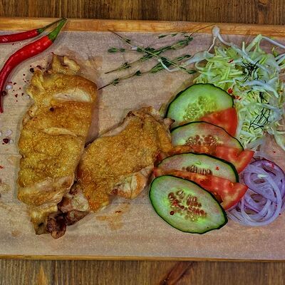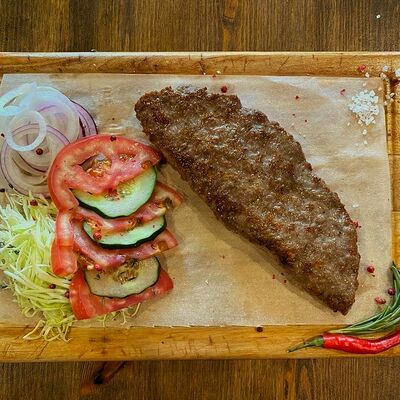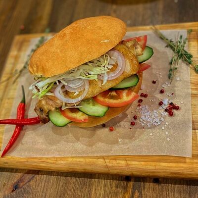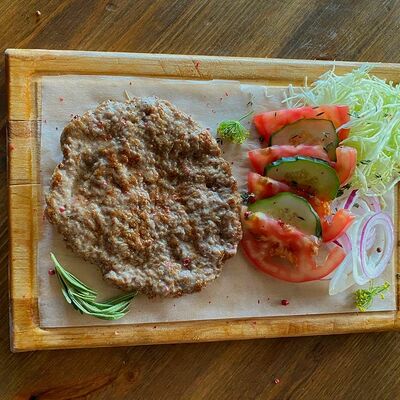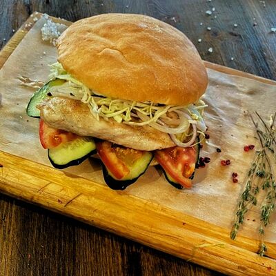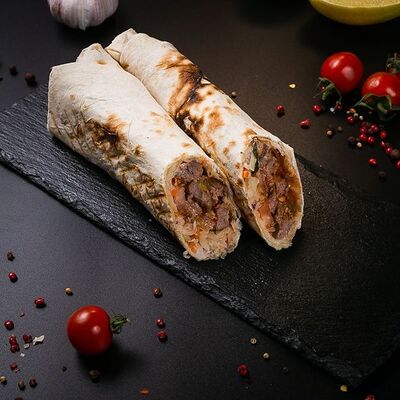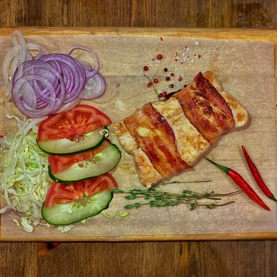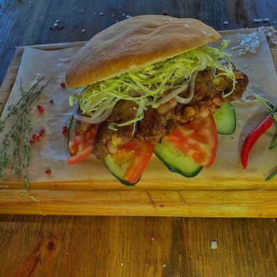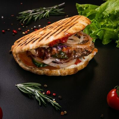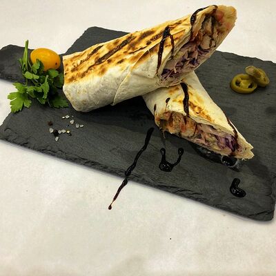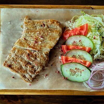 Филе куриное, капуста маринованная, свежие помидор и огурец, маринованный лук, соус на выбор, лепешка