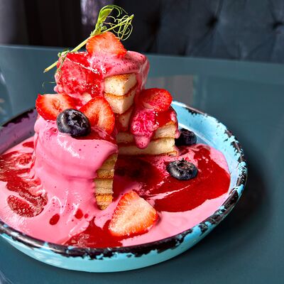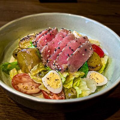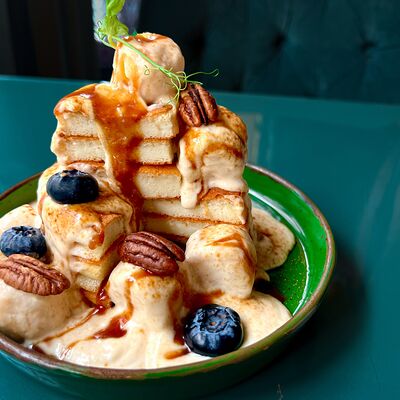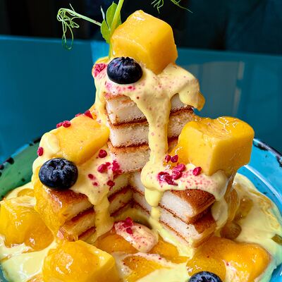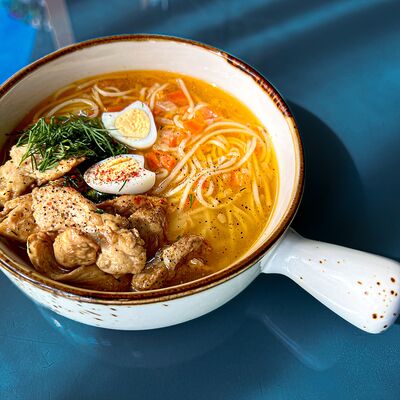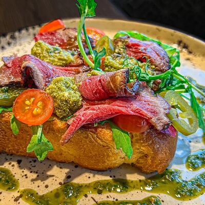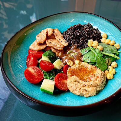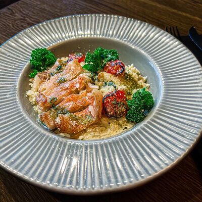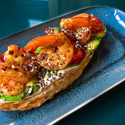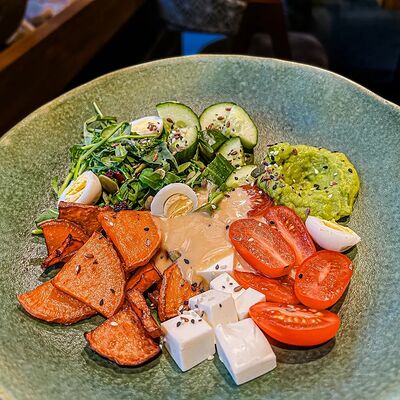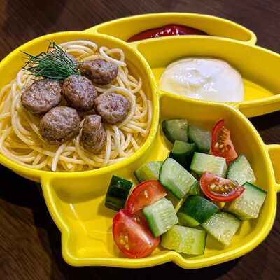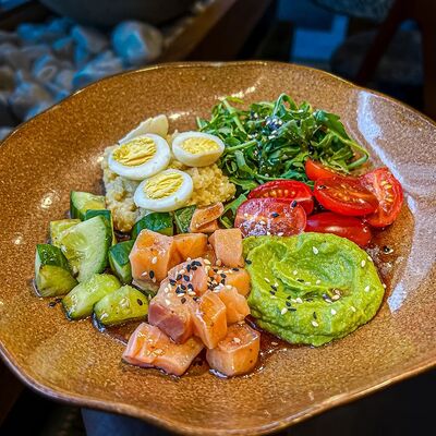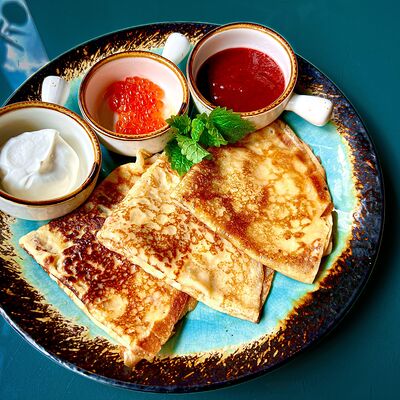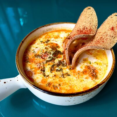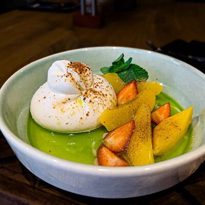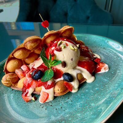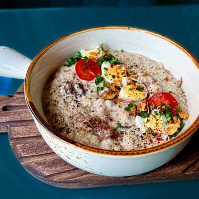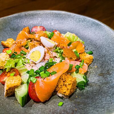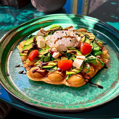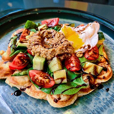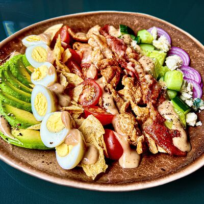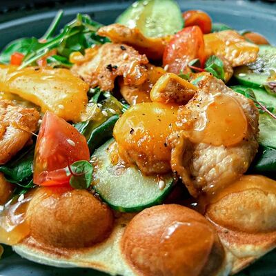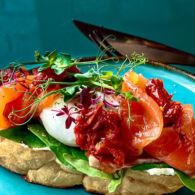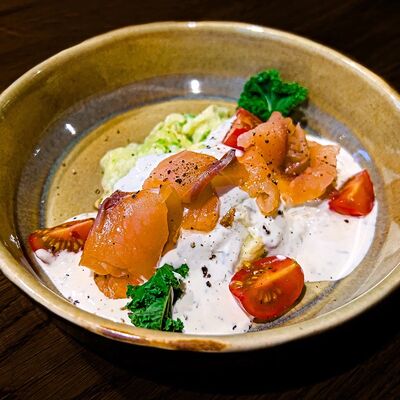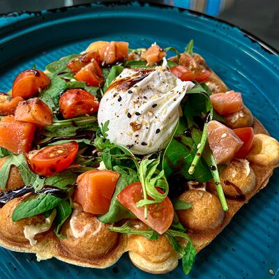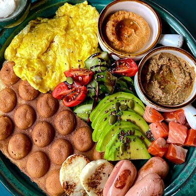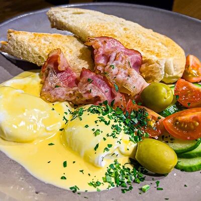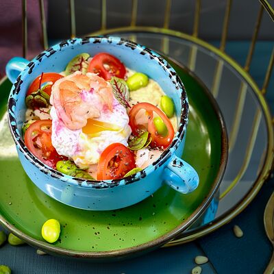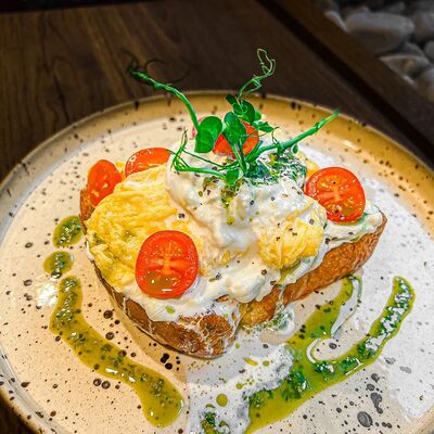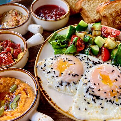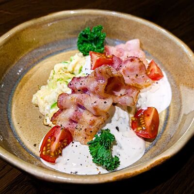 Яйцо, кабачок, бекон, соус ранч, черри, специи
