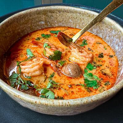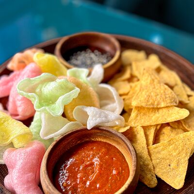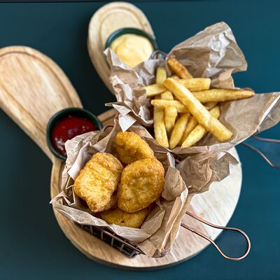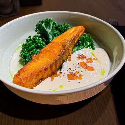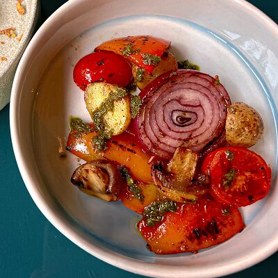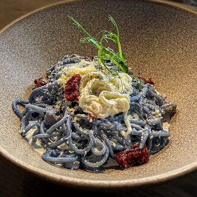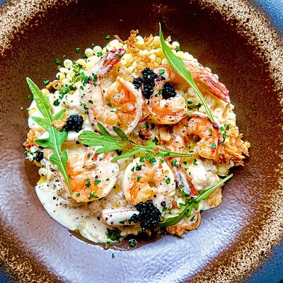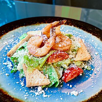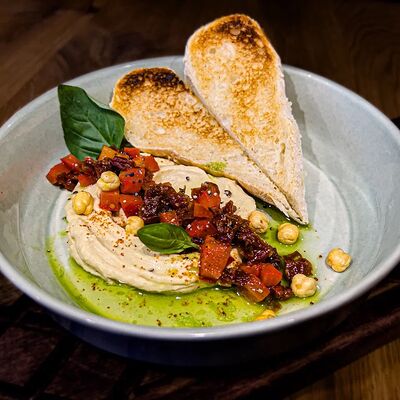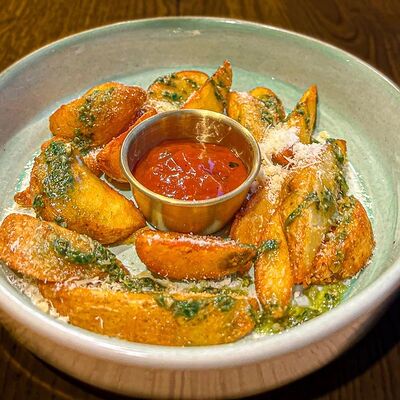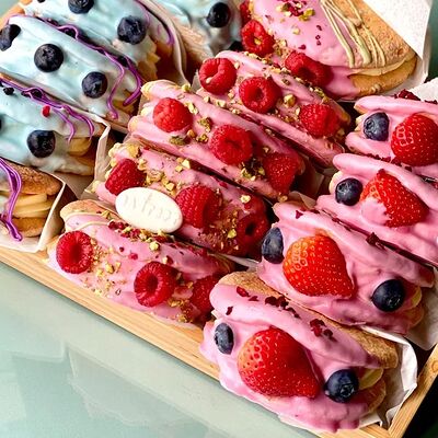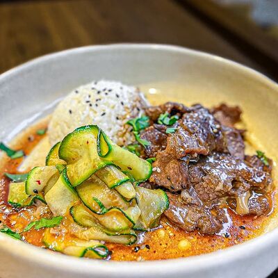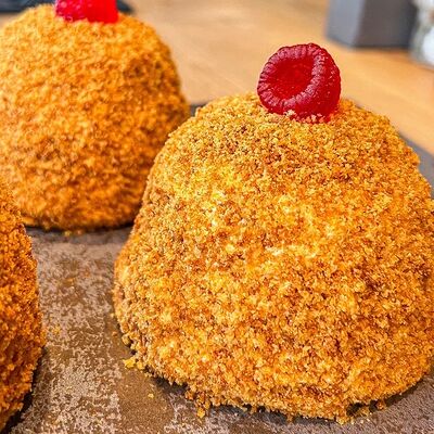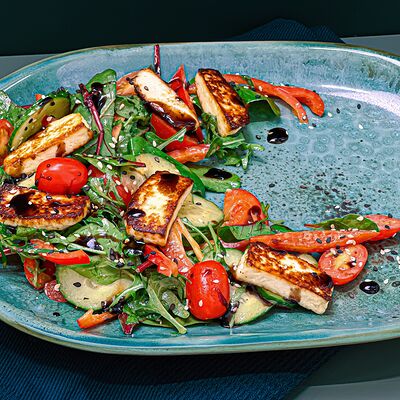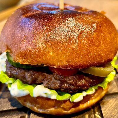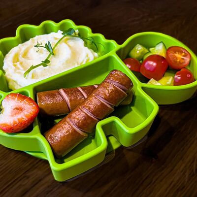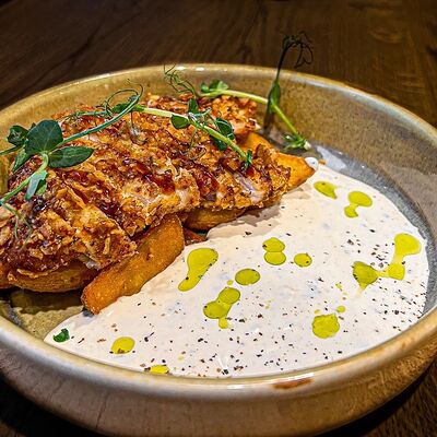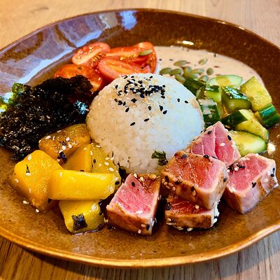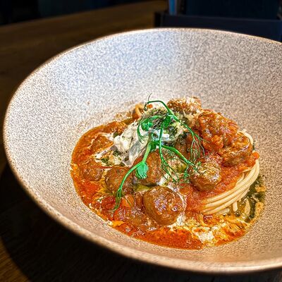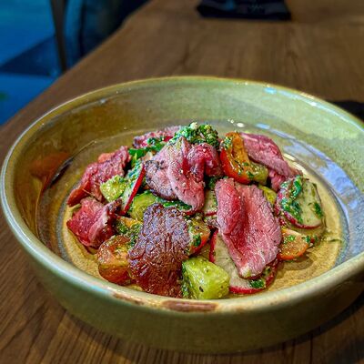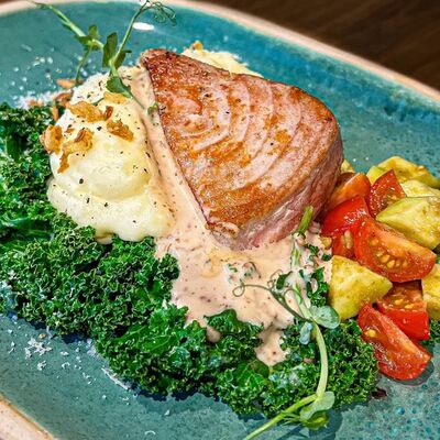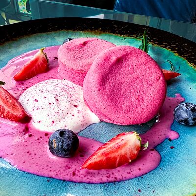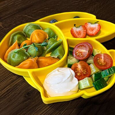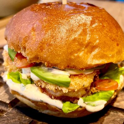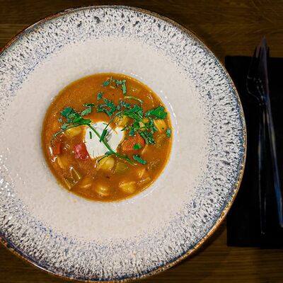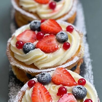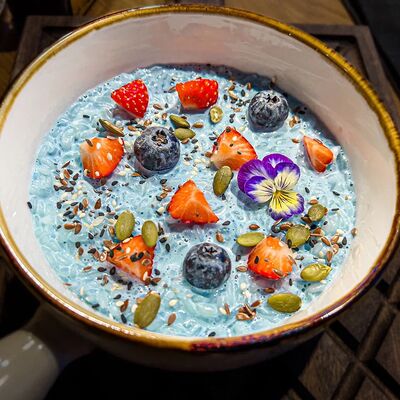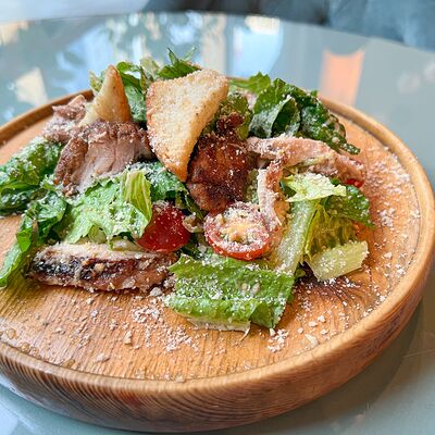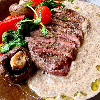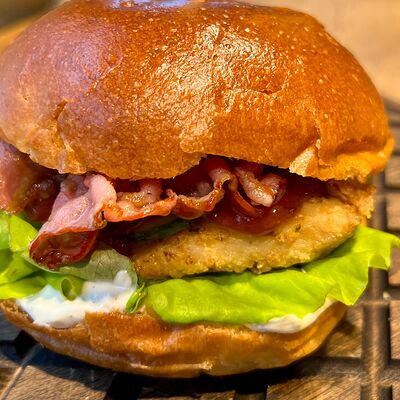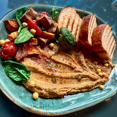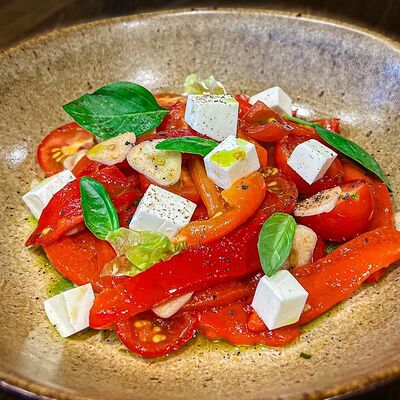Яйцо, кабачок, бекон, соус ранч, черри, специи