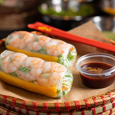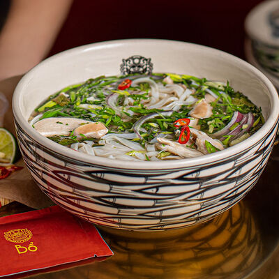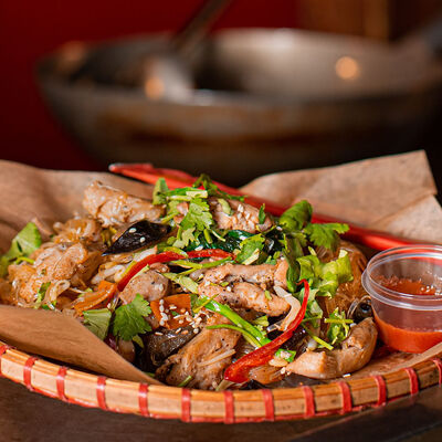 Обжаренная на мангале свиная грудинка со специями. Подаётся с лапшой бун, зеленью и соусом ныок чам