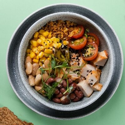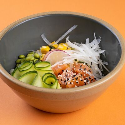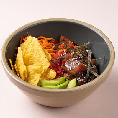 Рис, филе тунца в соевом соусе, нори, авокадо, томаты черри, имбирь маринованный, морковь, спайси соус