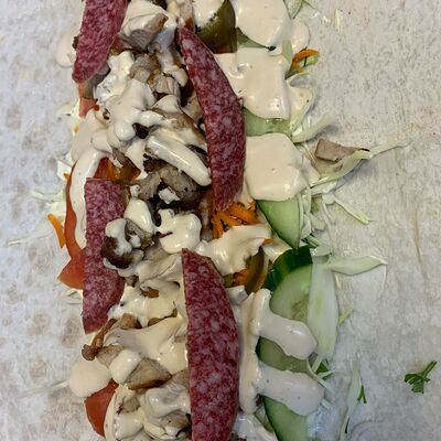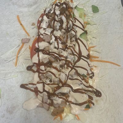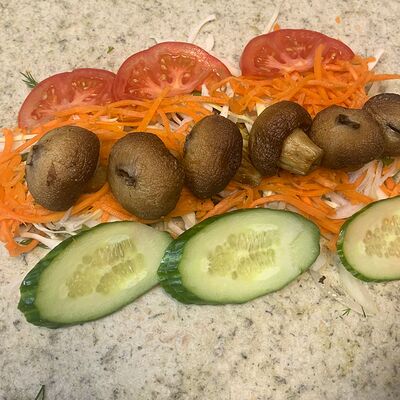 Куриное филе, капуста, корейская морковка, помидоры, огурцы, сыр, фирменный соус