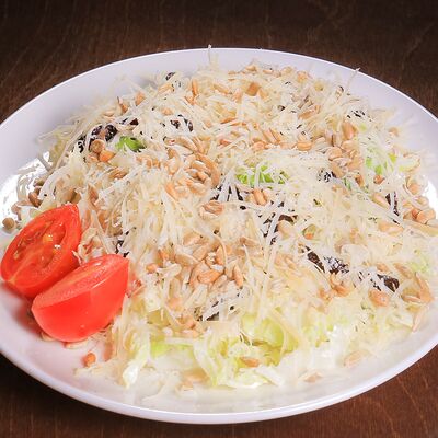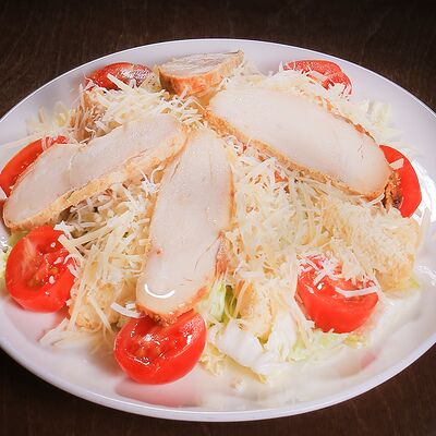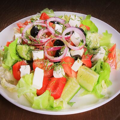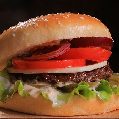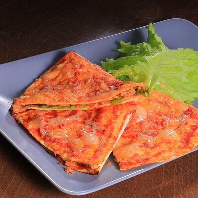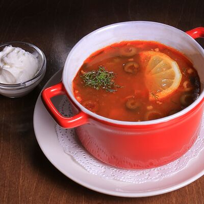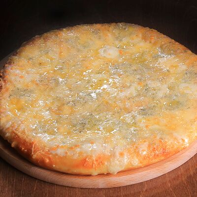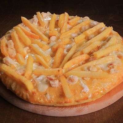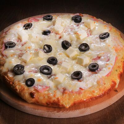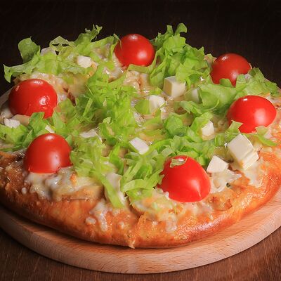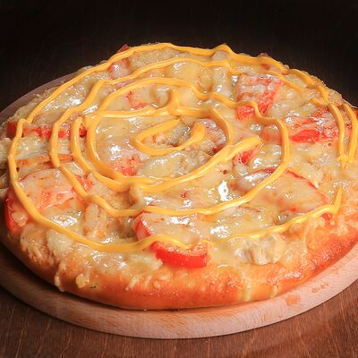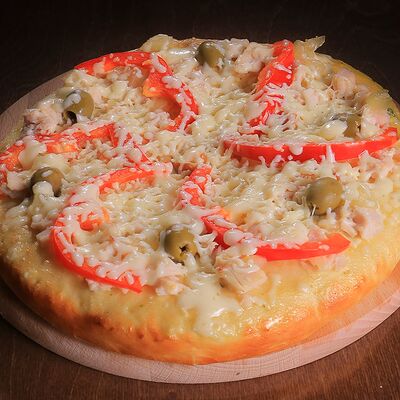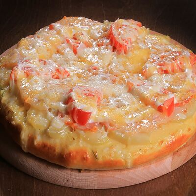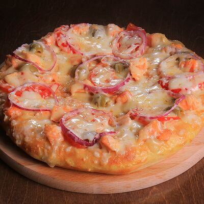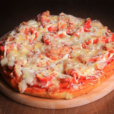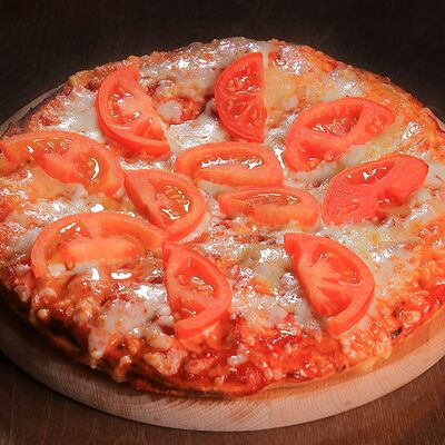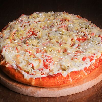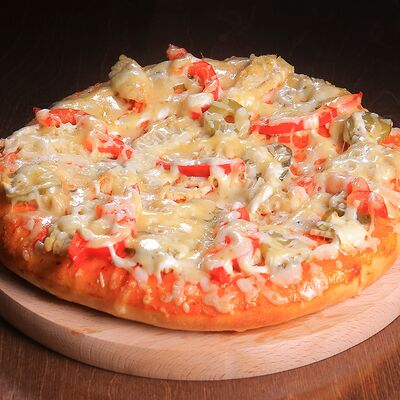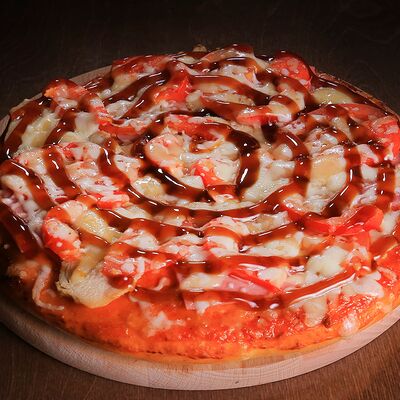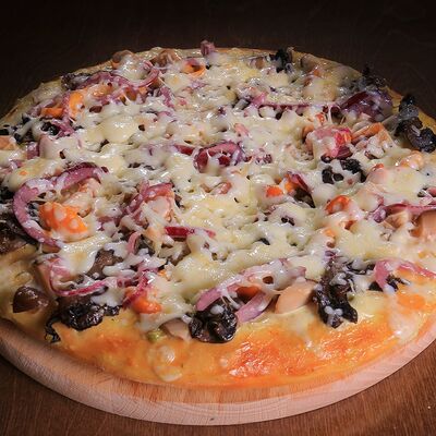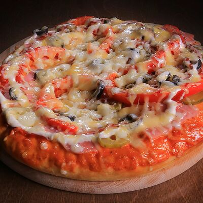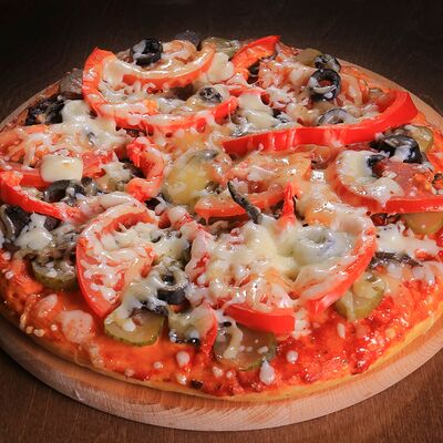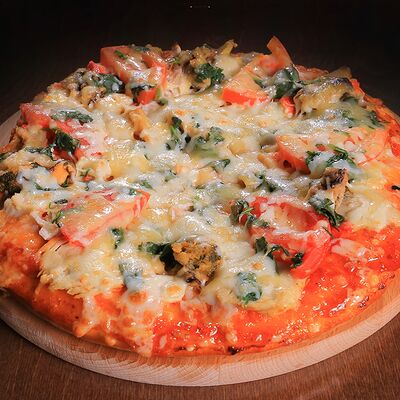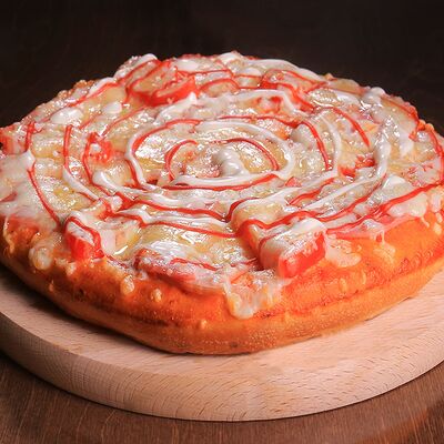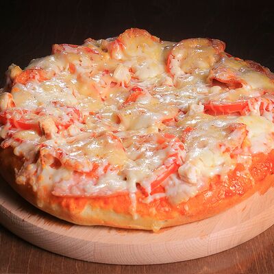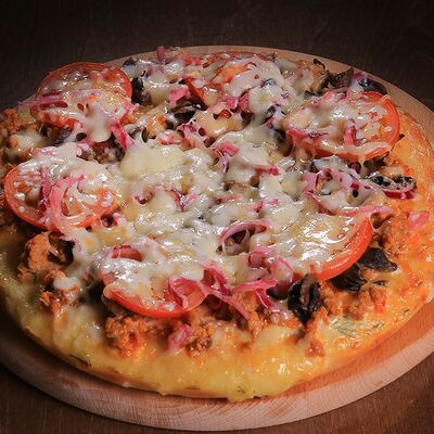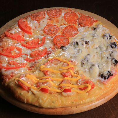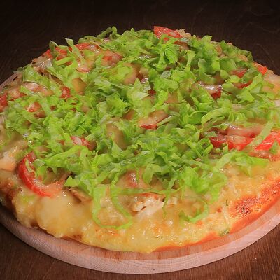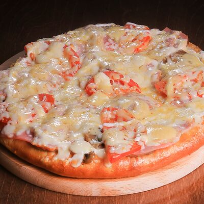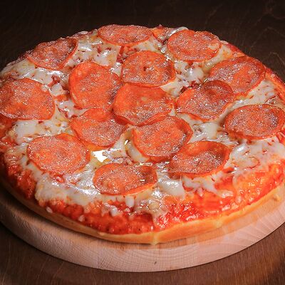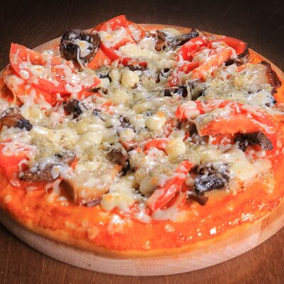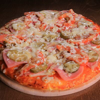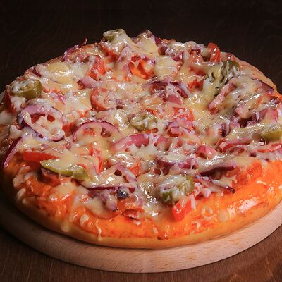 Колбаски охотничьи, пепперони, томаты, красный лук, халапеньо, сыр моцарелла, сыр гауда, соус острый, соус томатный, живое тесто, зелень. Размер на выбор