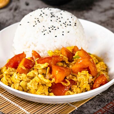 Жареное яйцо с помидором с рисом доставка