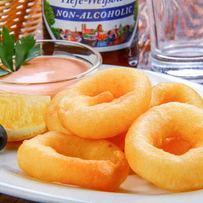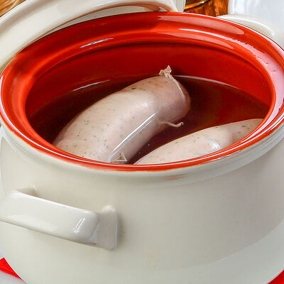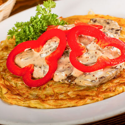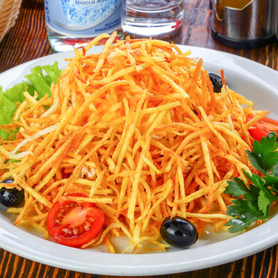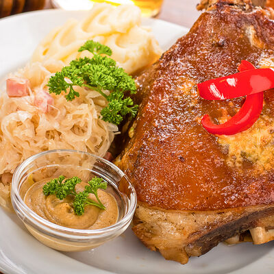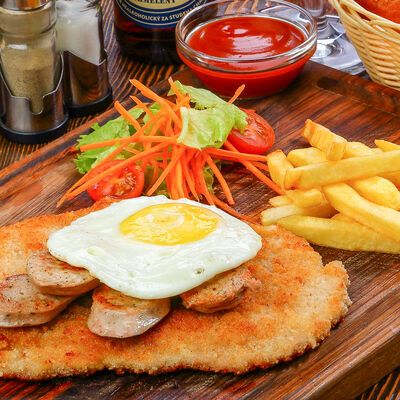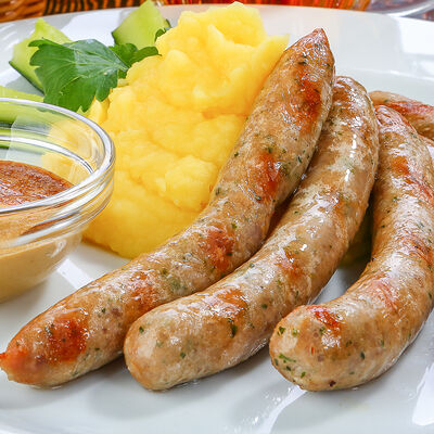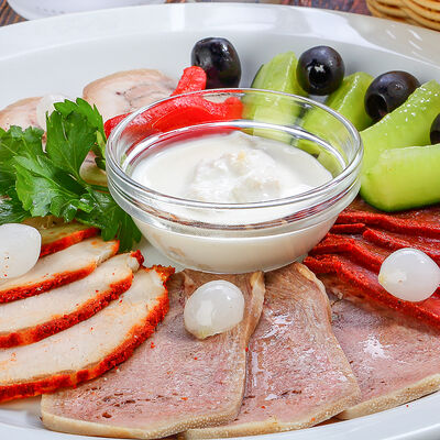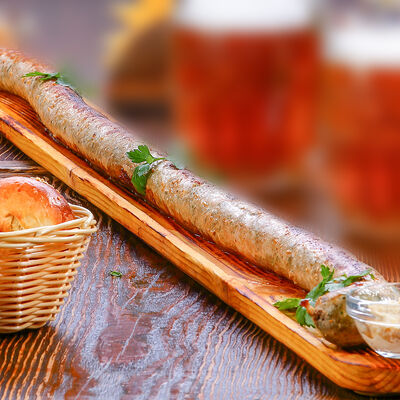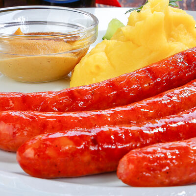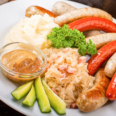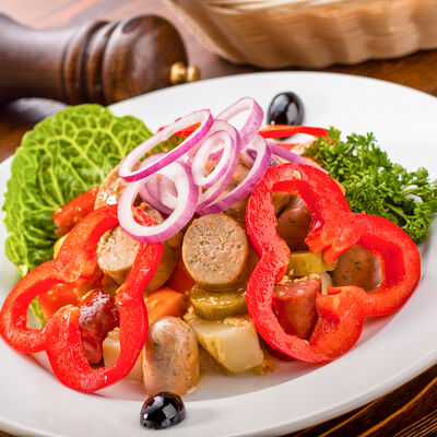 Наш фирменный салат с немецкими колбасками, сыром, красным луком, маринованным огурчиком под горчичной заправкой