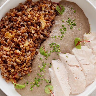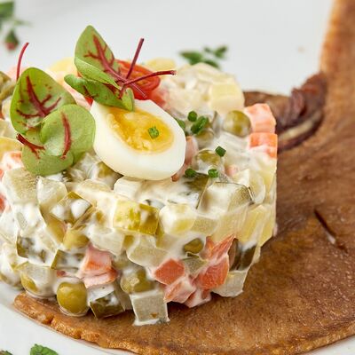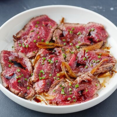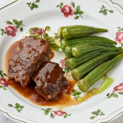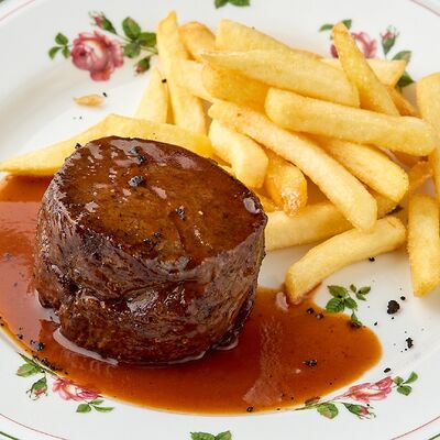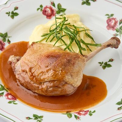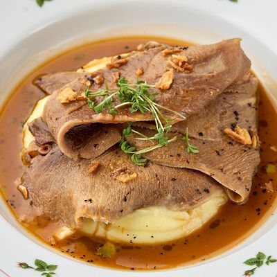 Фирменное блюдо нашего шефа, нежный телячий язык подаём в мясном соусе демигласс и воздушным картофельным пюре