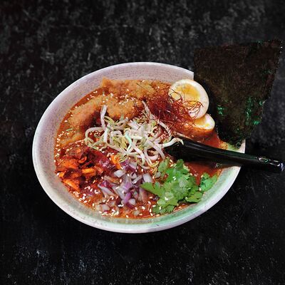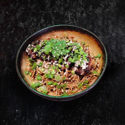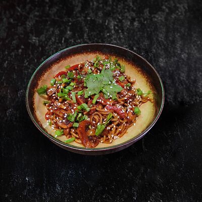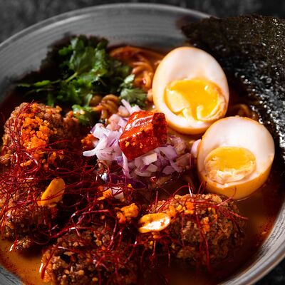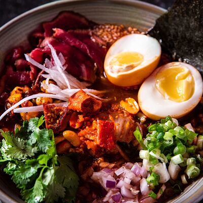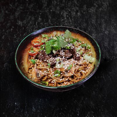 Наваристый говяжий бульон с добавлением разных видов масел, копченого перца и копченой кукурузы с имбирем. Подаём с ростбифом