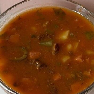 Картофель, говядина, буженина, колбаса полукопченая, маслины, лимон, томатная паста, зелень