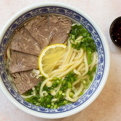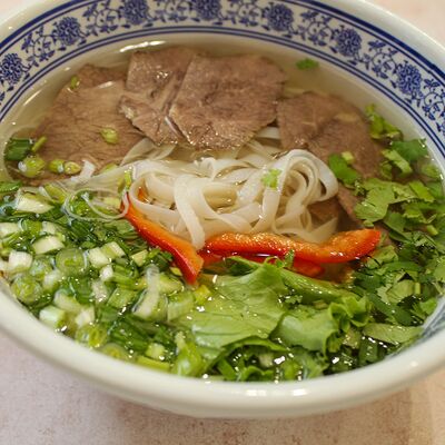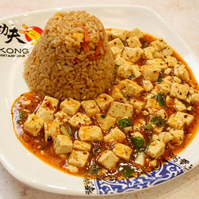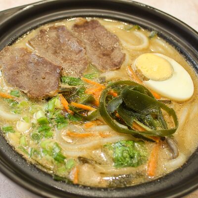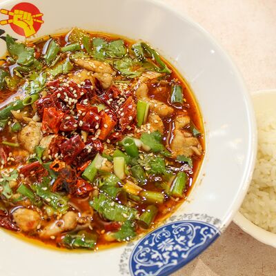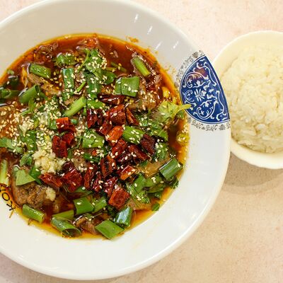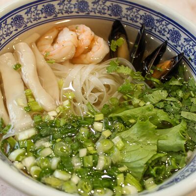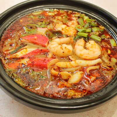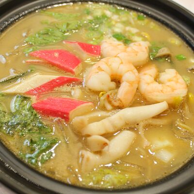 Бульон, креветки, кальмары, тофу, крабовые палочки, стеклянная лапша, зелень, острый соус