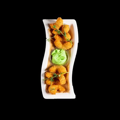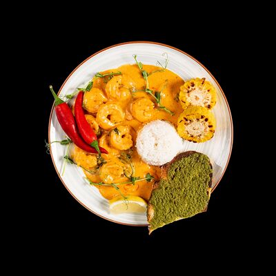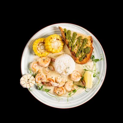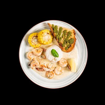 Креветки тигровые, белое вино, сливки, чеснок, специи, кукуруза, хлеб, зелёное масло, лимон. Подаются с рисом