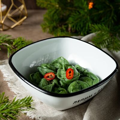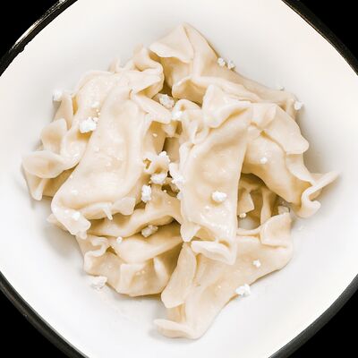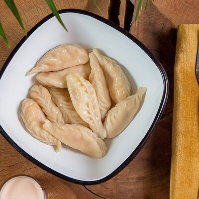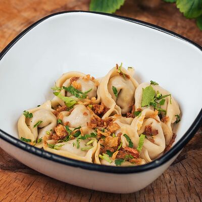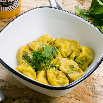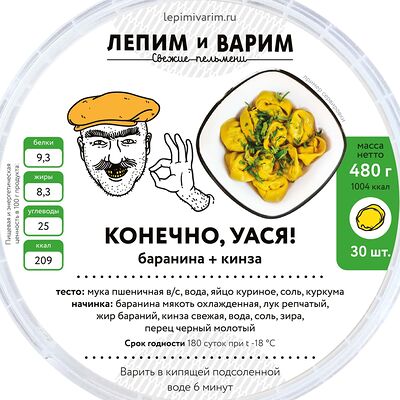 Тесто: мука пшеничная высшего сорта, вода питьевая, яйцо куриное, соль, куркума, начинка: баранина мякоть охлажденная, лук репчатый, жир бараний, кинза свежая, вода питьевая, соль, зира, перец черный молотый