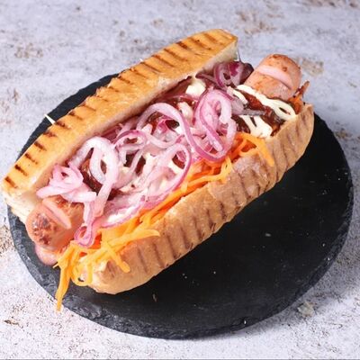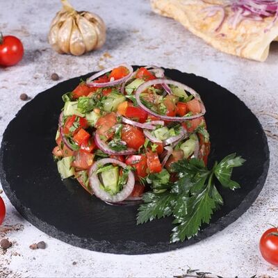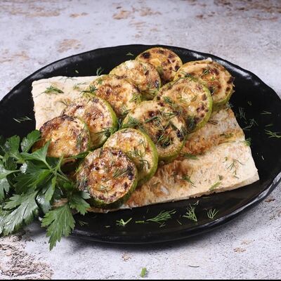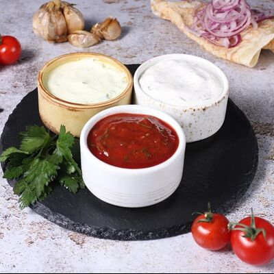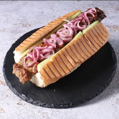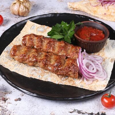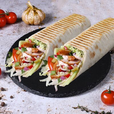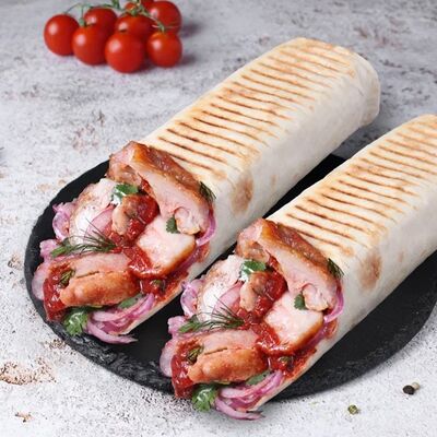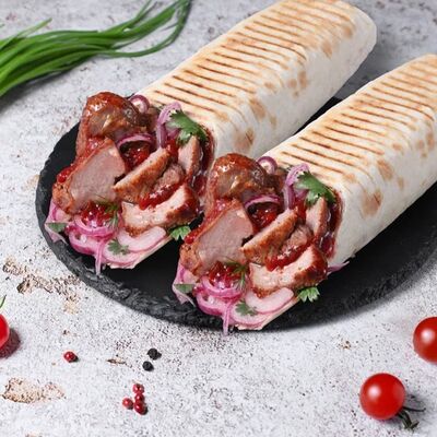 Лаваш армянский, фарш говяжий, салат из пекинской капусты и кинзы, красный салатный лук, огурцы, помидоры, соус белый чесночный, перец острый халапеньо