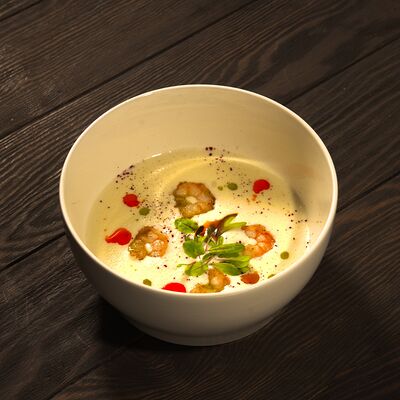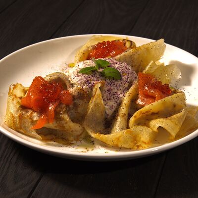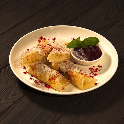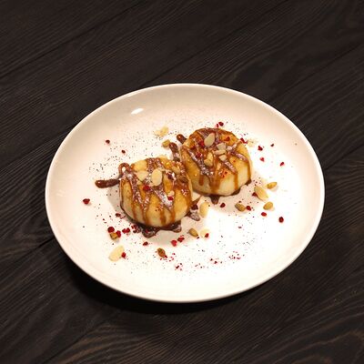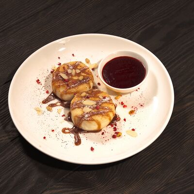 Сырники (творог 9%, мука, яйца). Подача с карамелью, кедровыми орехами и лепестками миндаля