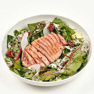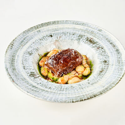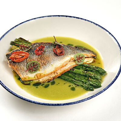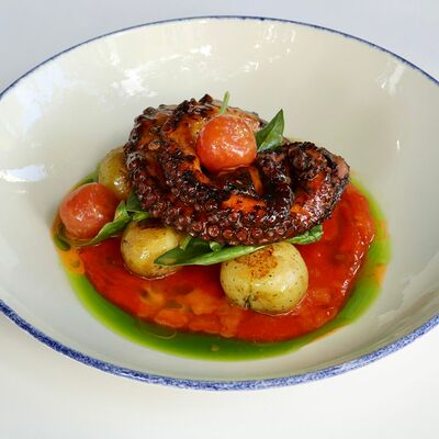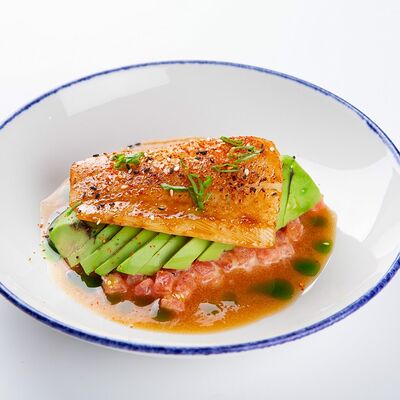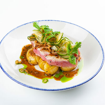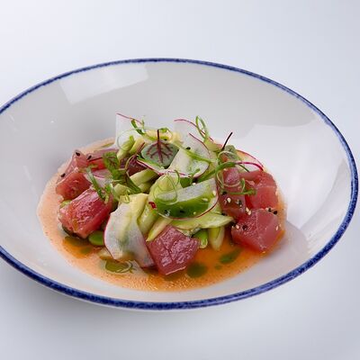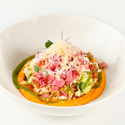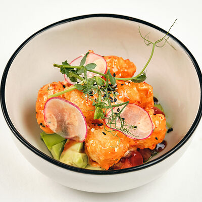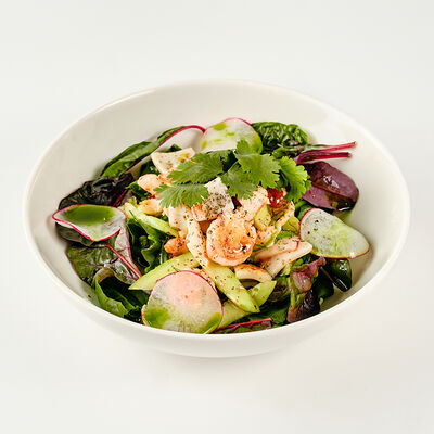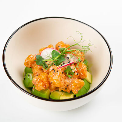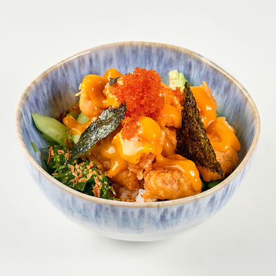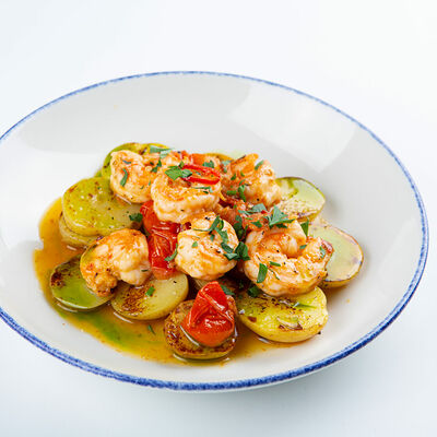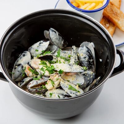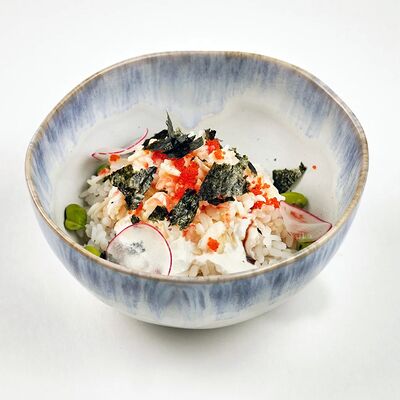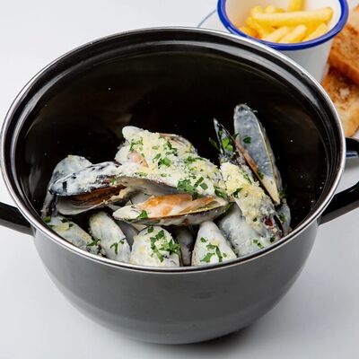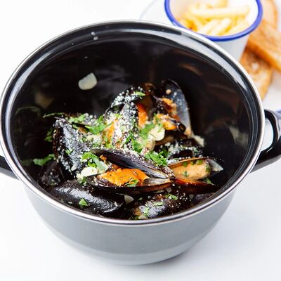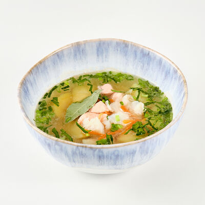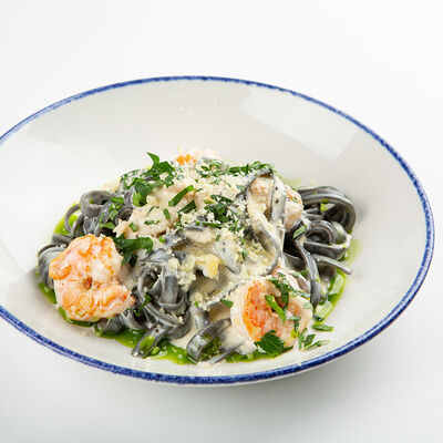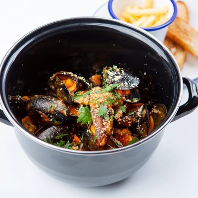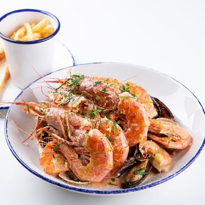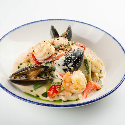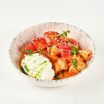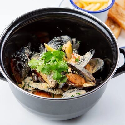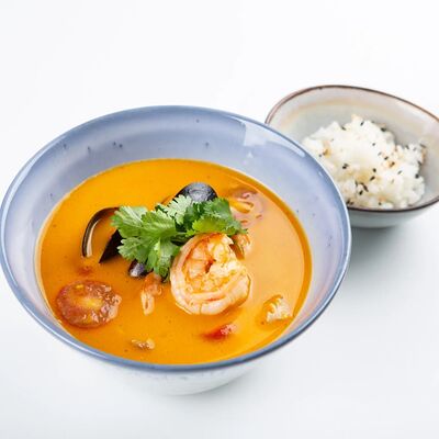 Острый азиатский суп с кислиной лайма на основе кококсового молока, с добавлением имбиря, лемонграса, галангала, шампиньонов, томатов черри, с мидиями и тигровыми креветками