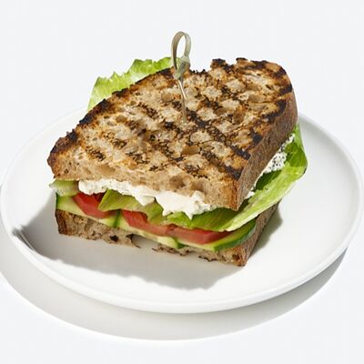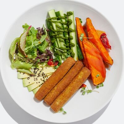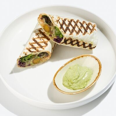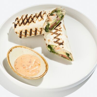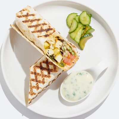Лаваш из пшеничной муки, тофу, огурцы свежие уже внутри, томаты, маринованная морковь, томатный соус, льняной майонез, листья салата