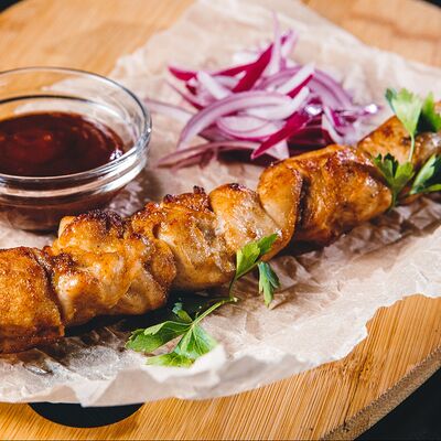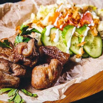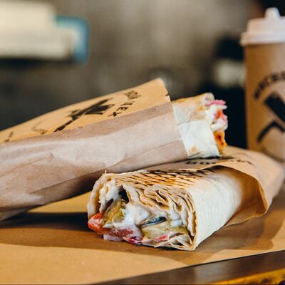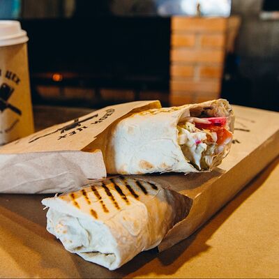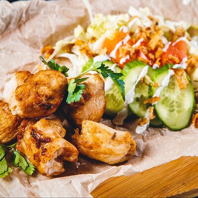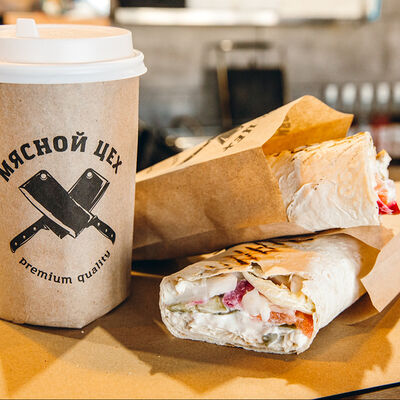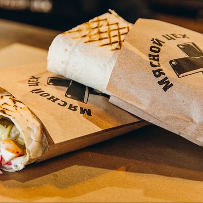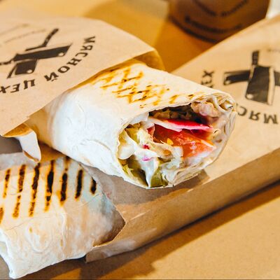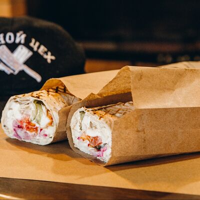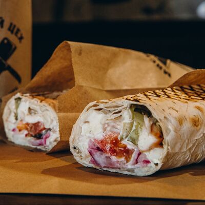 Мясо на выбор, салат айсберг, маринованный огурец, свежие томаты, хрустящий лук, соус кефирный, соус горчичный