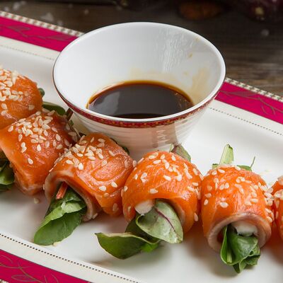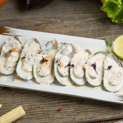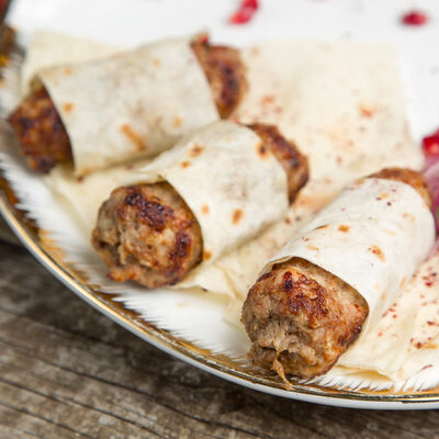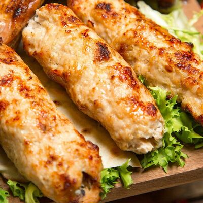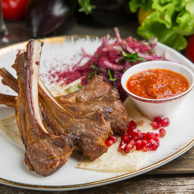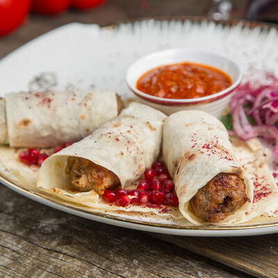 Нежный фарш из баранины с рисом, луком репчатым, миксом зелени, завернутый в винoградные листья, соус Мацони