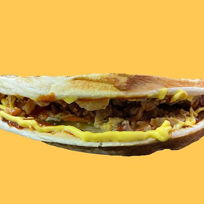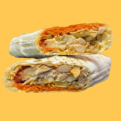 Лепешка донер, курица, морковка по-корейски, помидоры, огурцы, капуста, томатный соус, чесночный соус