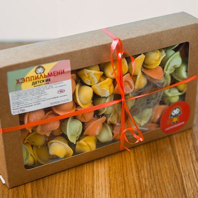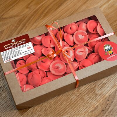 Тесто пельменное, мука, шпинат, яйцо куриное, соль, филе горбуши, филе форели, сливки 10%, лук репчатый, перец черный молотый. Подается с укропом, сливочным маслом и жареным луком