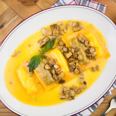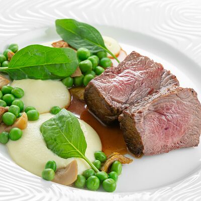 Стейк из говядины, приготовленный су-вид с обжаренными белыми грибами, муссом из картофеля и зелёным горошком