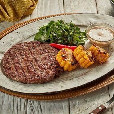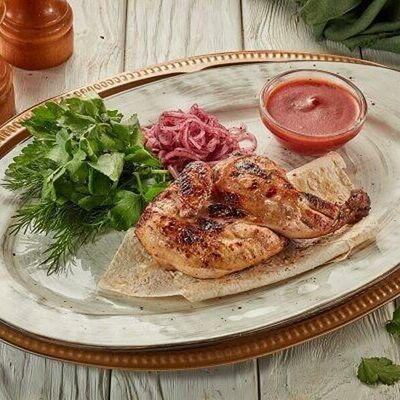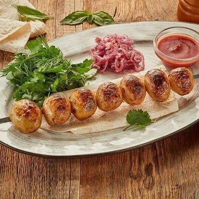 Сочный люля из мясного фарша, приготовленный на мангале. Подается со свежей зеленью и томатным соусом