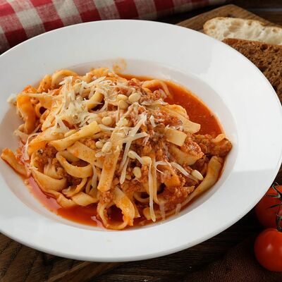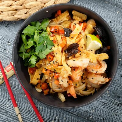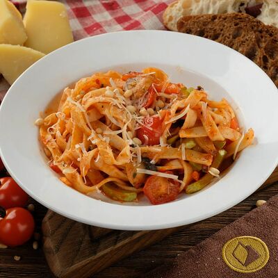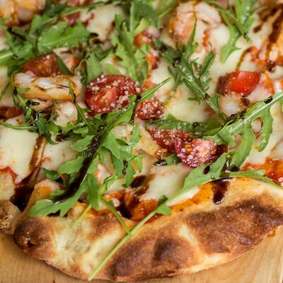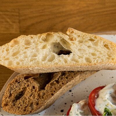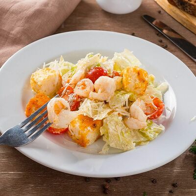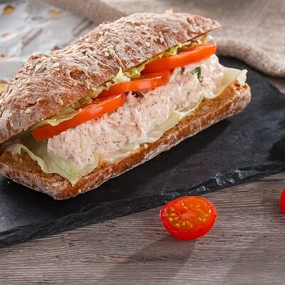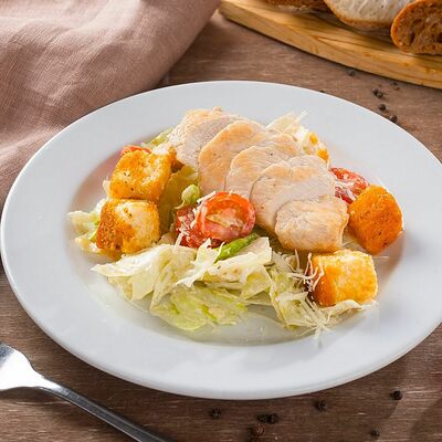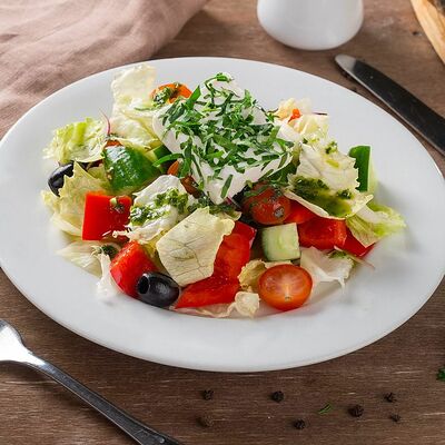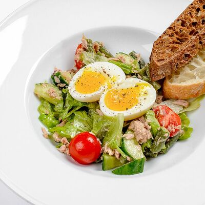 Салат айсберг, помидоры черри, свежие огурцы, фасоль стручковая, лук красный, тунец консервированный. Подается со свежим багетом