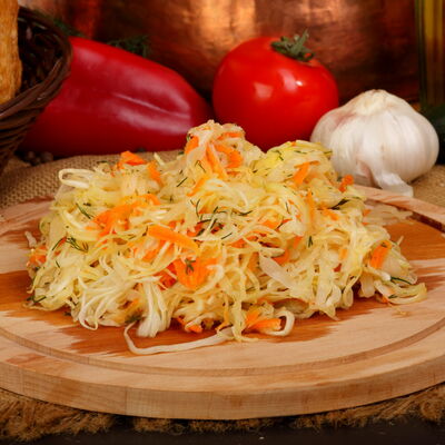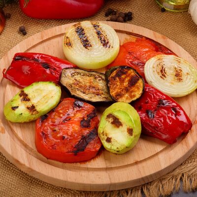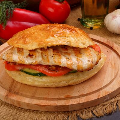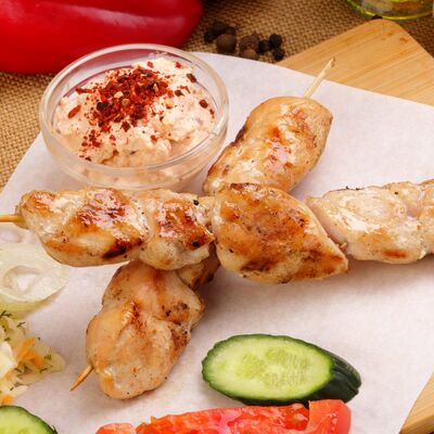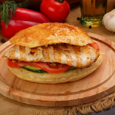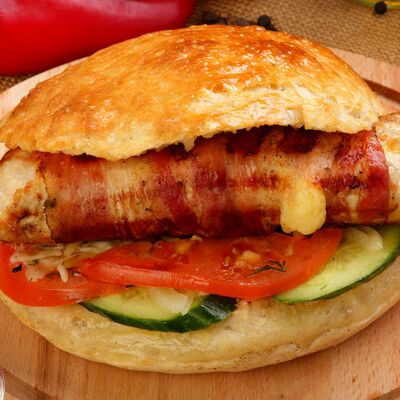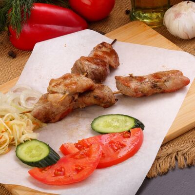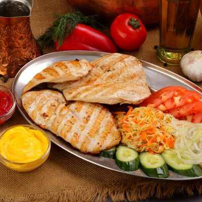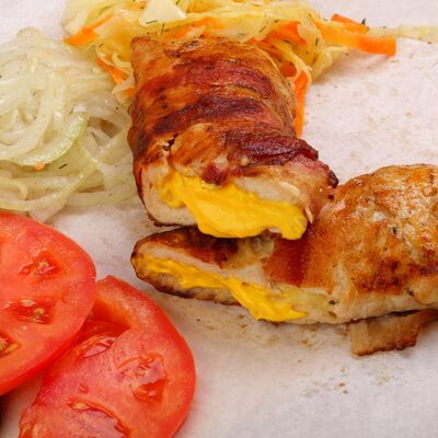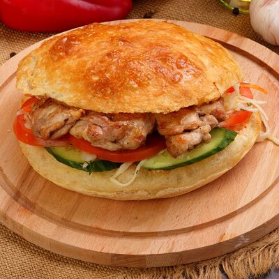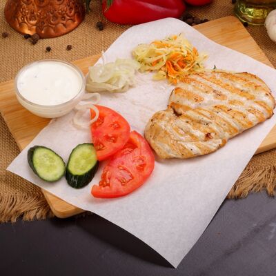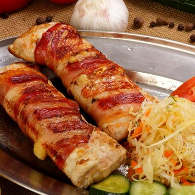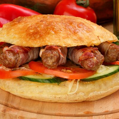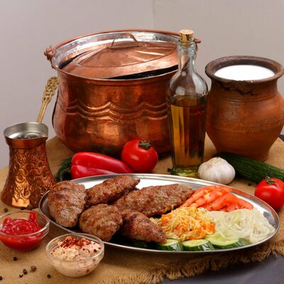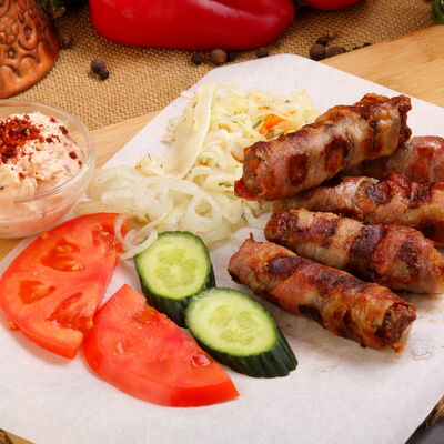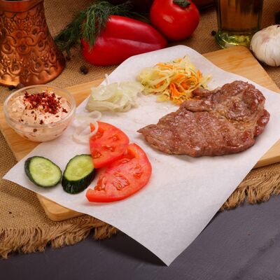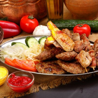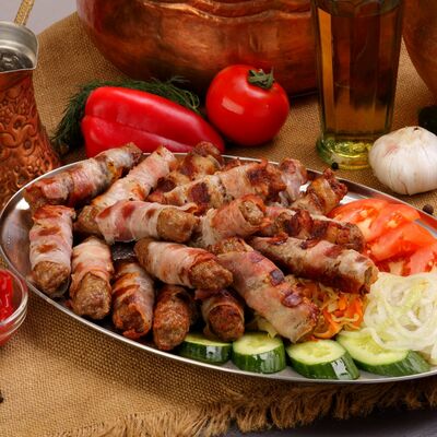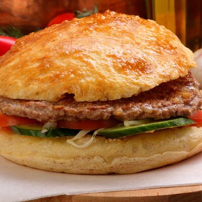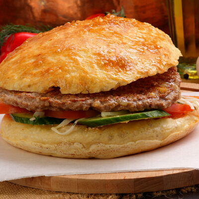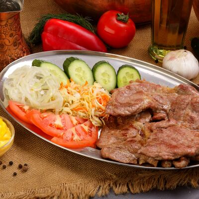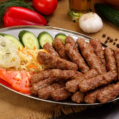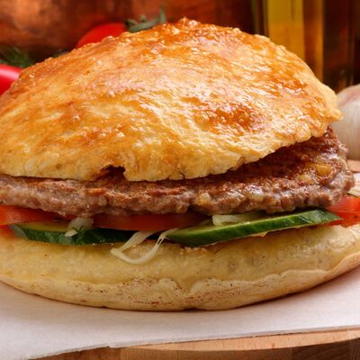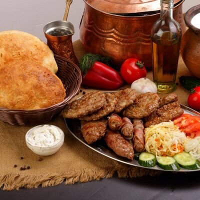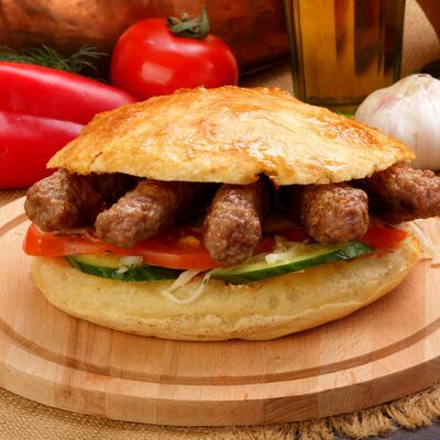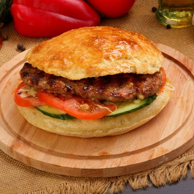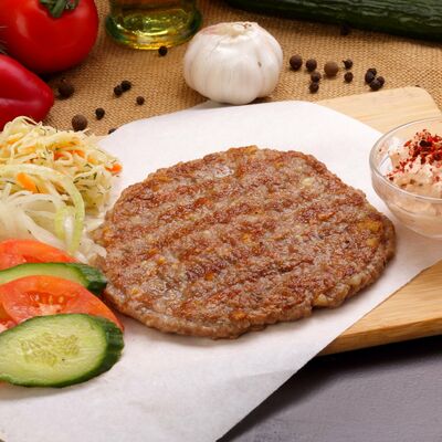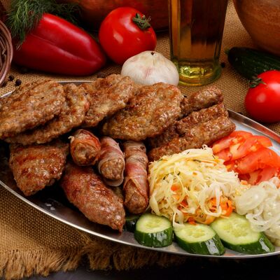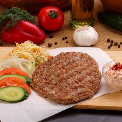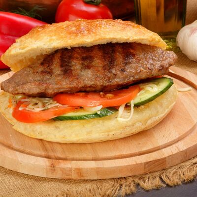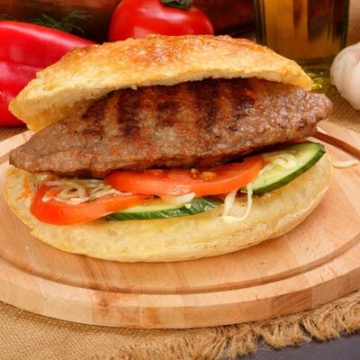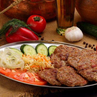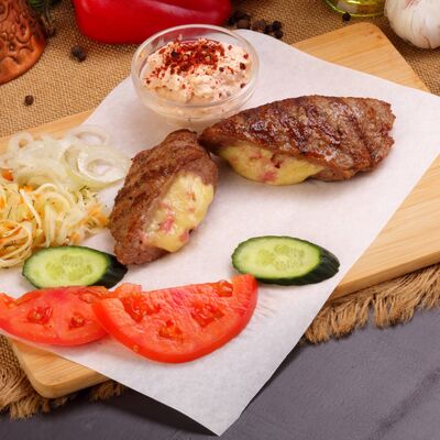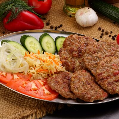 Пять плескавиц из рубленной говядины, фаршированные сыром с подгарнировкой из овощей: помидоры, огурцы, салат из свежейкапусты, лук маринованный, две сербских лепешки, соус на выбор Общий вес 1500 гр