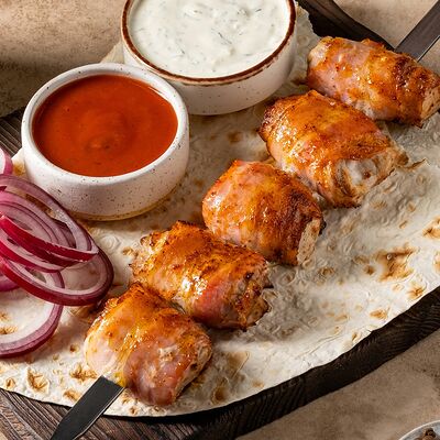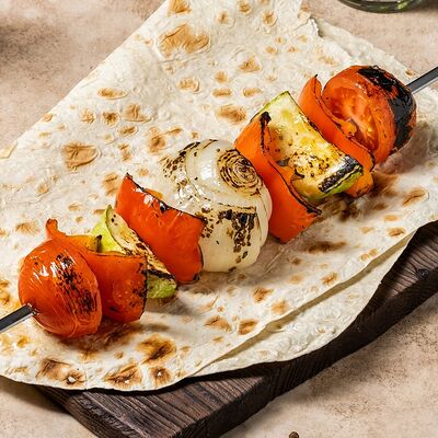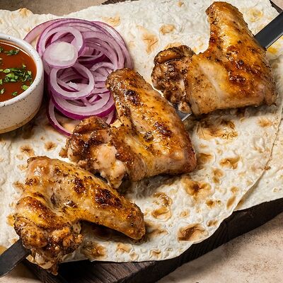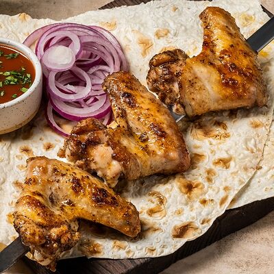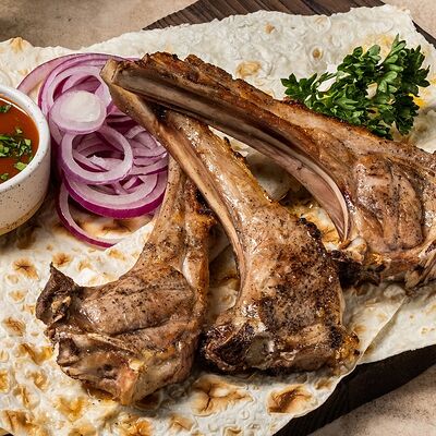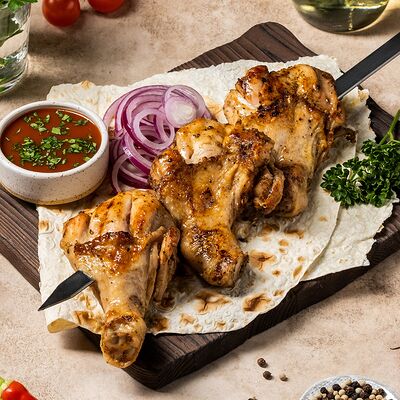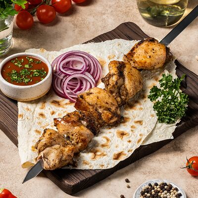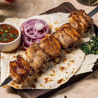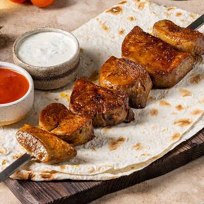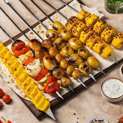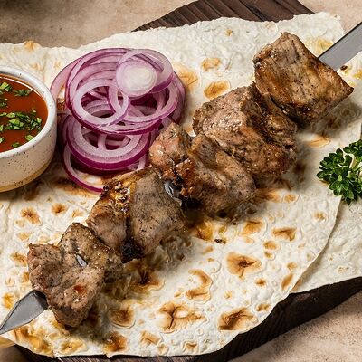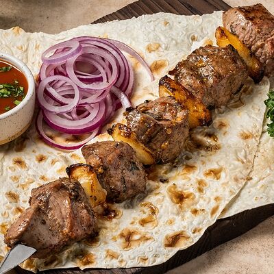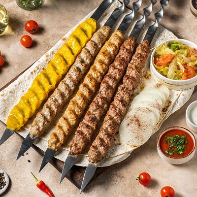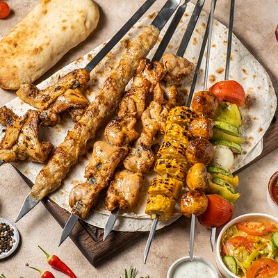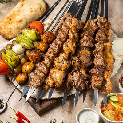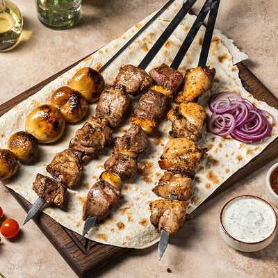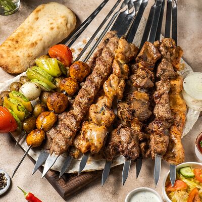 Шашлык из свинины (шея) (2 порции), шашлык из ягненка с курдючком (2 порции), шашлык из бедра цыпленка (филе) (3 порции), люля из телятины (2 порции), овощной шашлык (1 порция), картофель на мангале (2 порции), шампиньоны на мангале (1 порция), фирменный белый соус (3 шт.), фирменный красный соус (3 шт.), салат Витаминка (1 порция), пита (2 шт.)