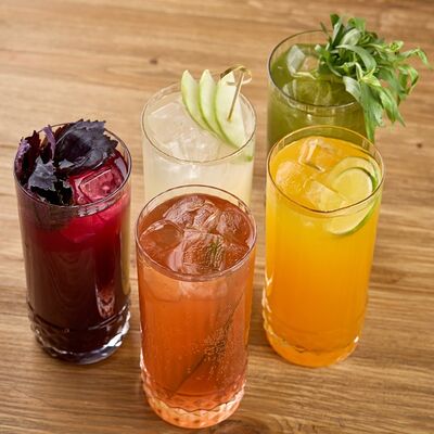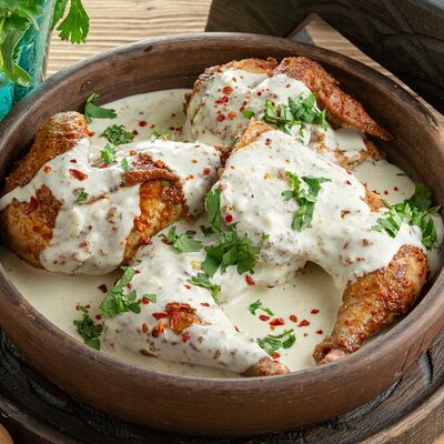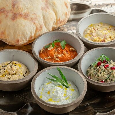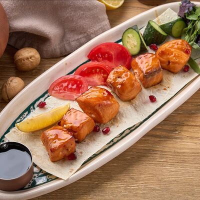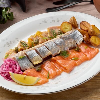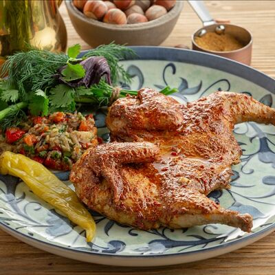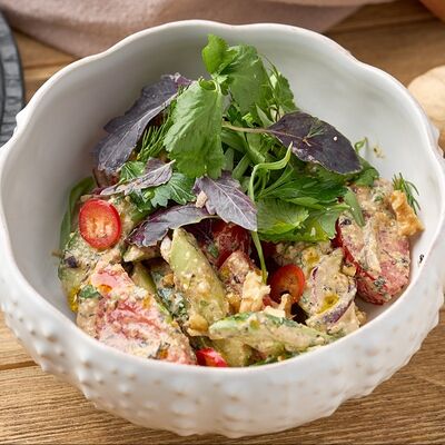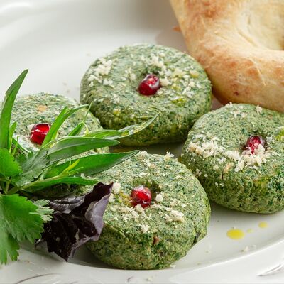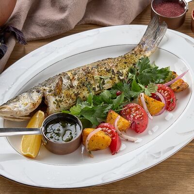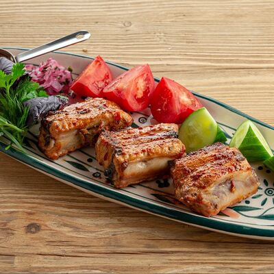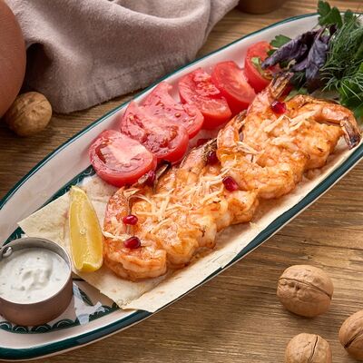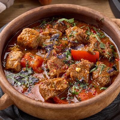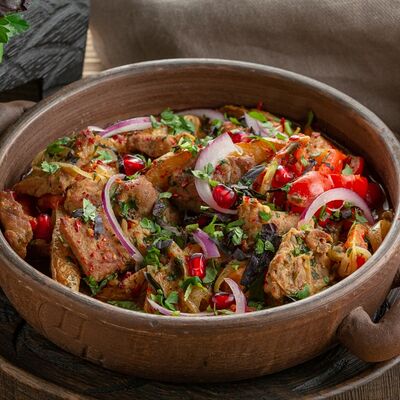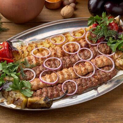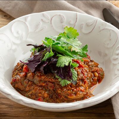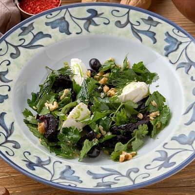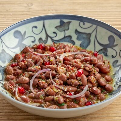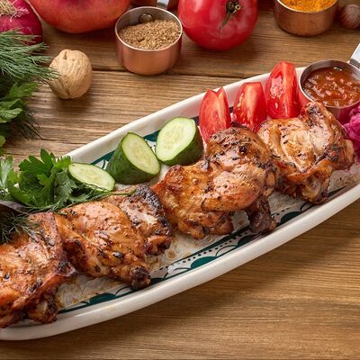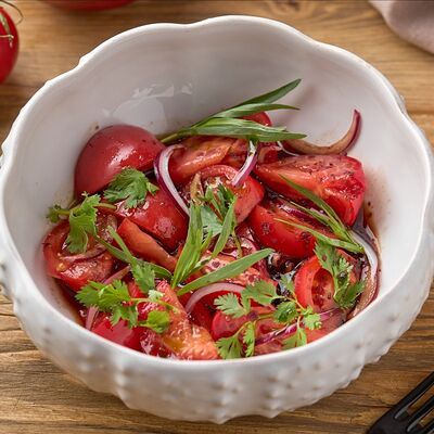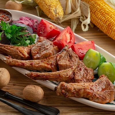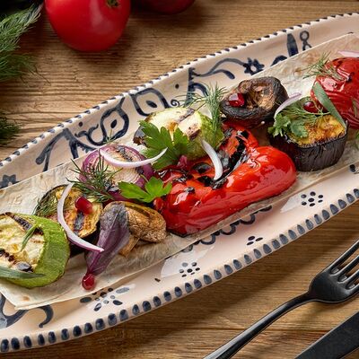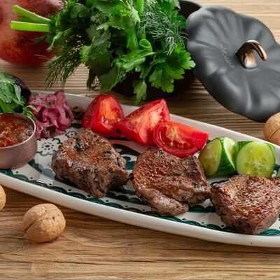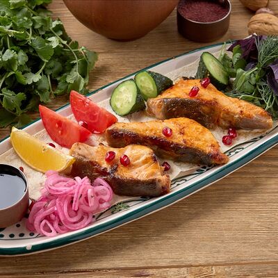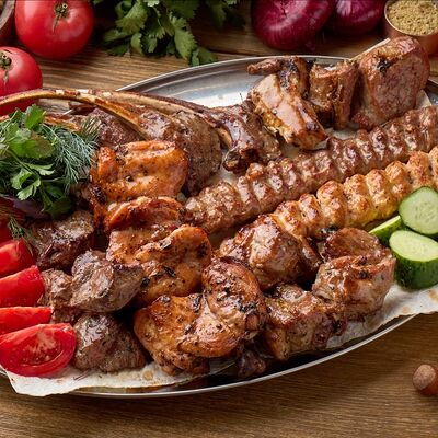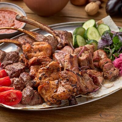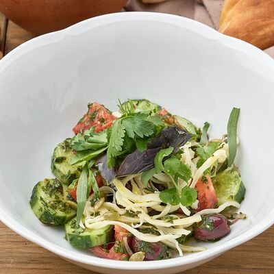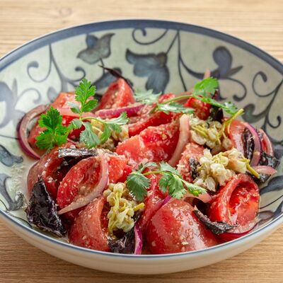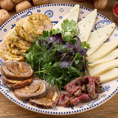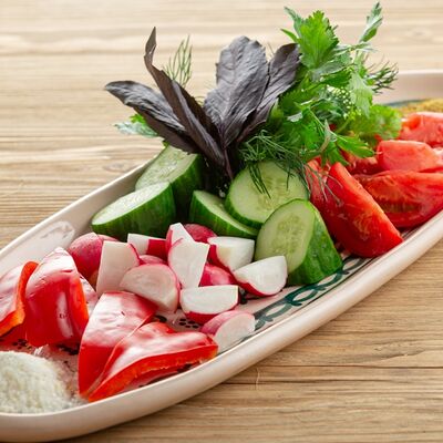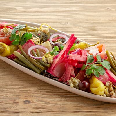 Соленые огурцы, соленые помидоры, острый перец, капуста по-гурийски, маринованный чеснок, соленая черемша, ткемали, джонджоли, красный лук и кинза