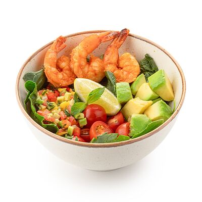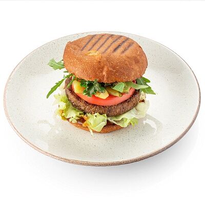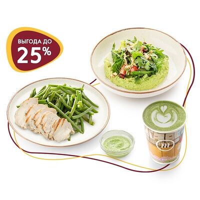 Глазунья, салат руккола, шпинат, колбаски из говядины, томаты черри, фасоль томленая (фасоль, томаты, чеснок, перец чили, хмели-сунели), багет цельнозерновой
