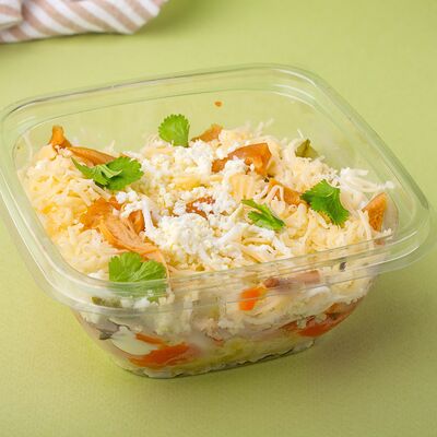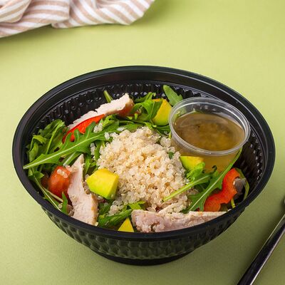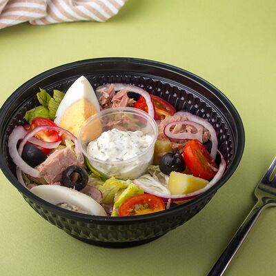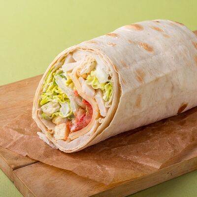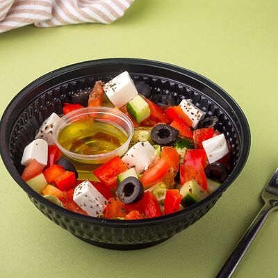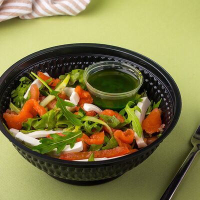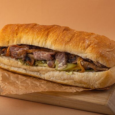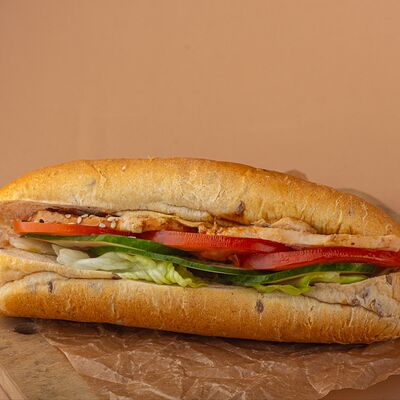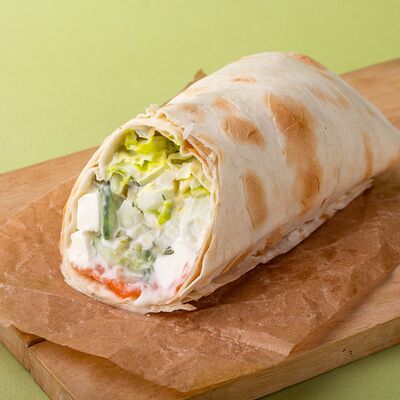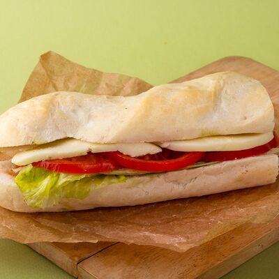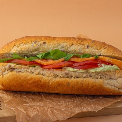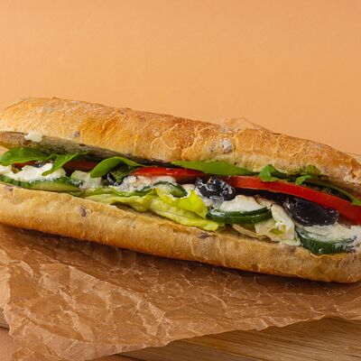Багет, томаты, огурцы, соус из рикотты с фетой, салатная смесь, маслины, соус чимичурри, руккола