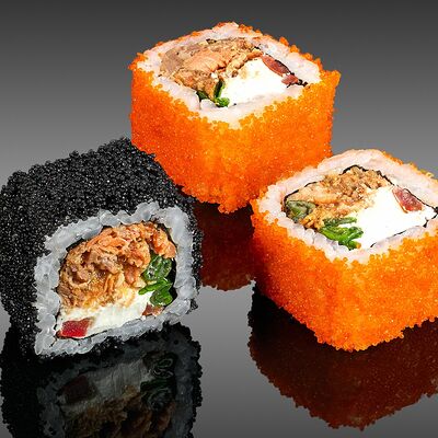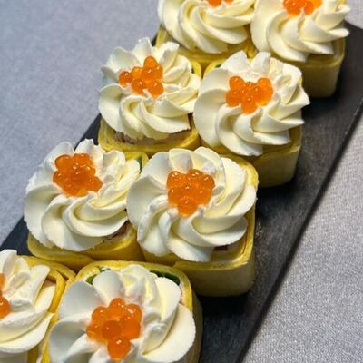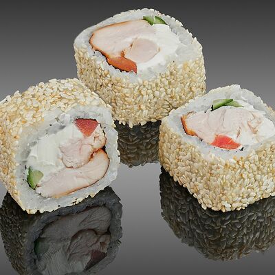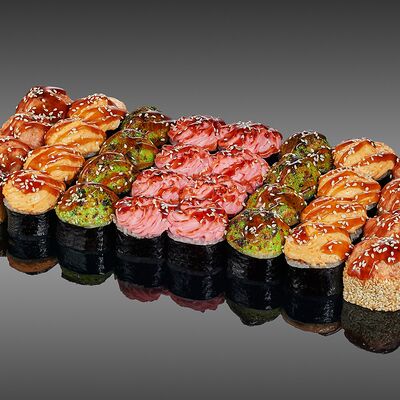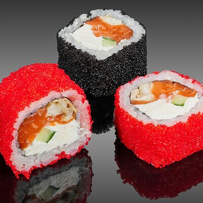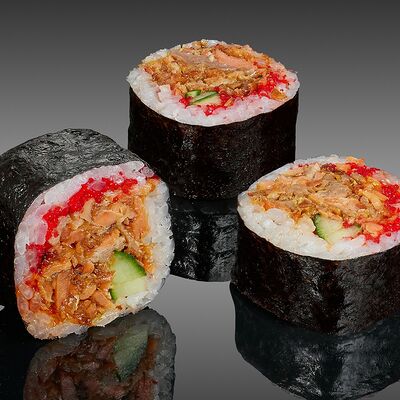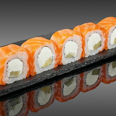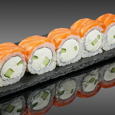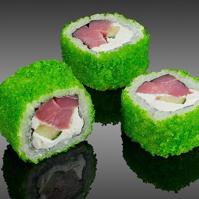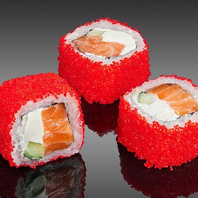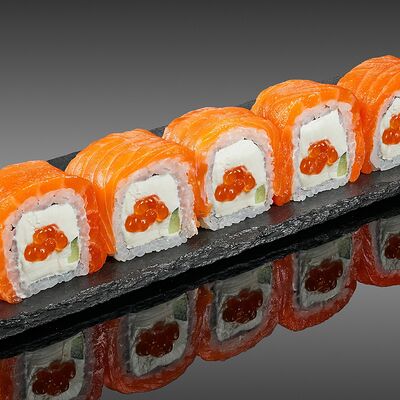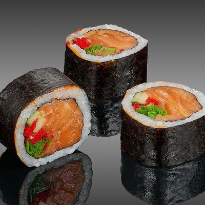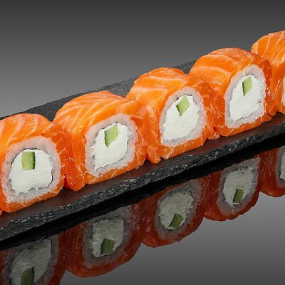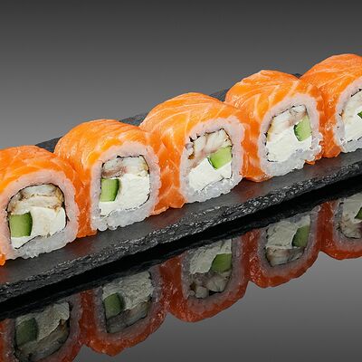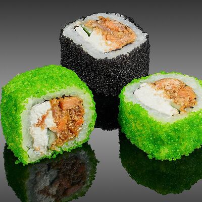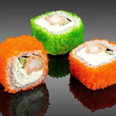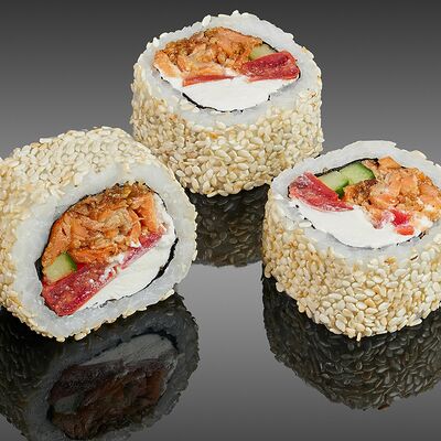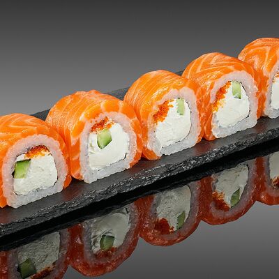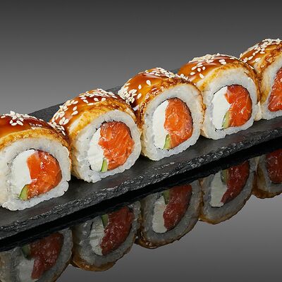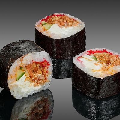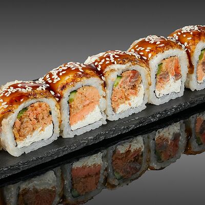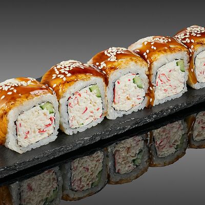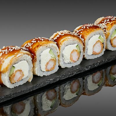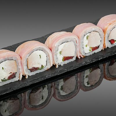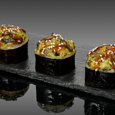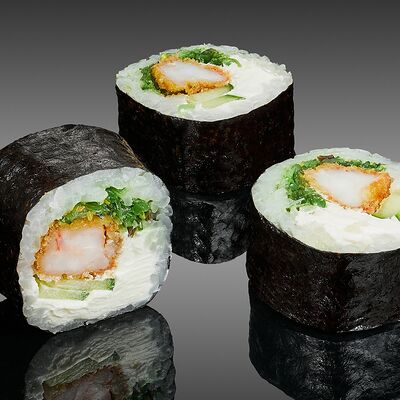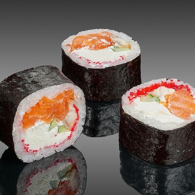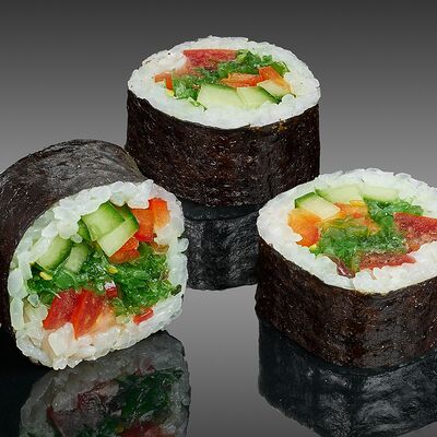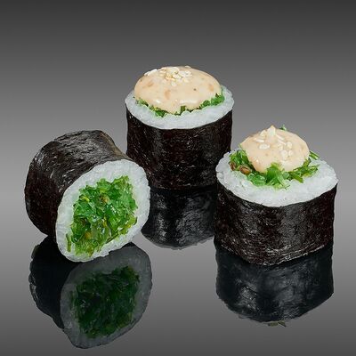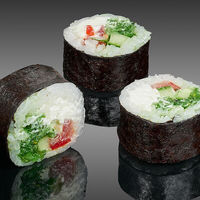 Рис, нори, сливочный сыр, салат чука, томат, огурец, ореховый соус (порция 8 шт)