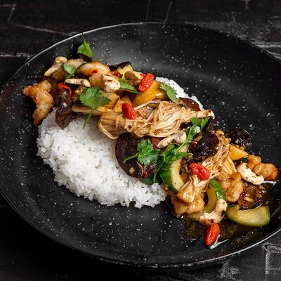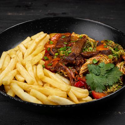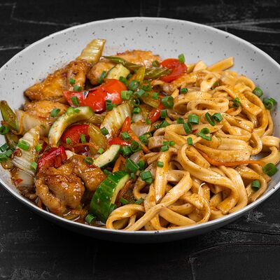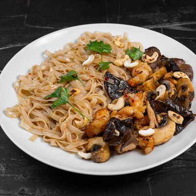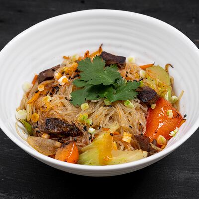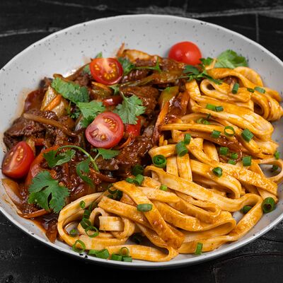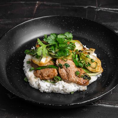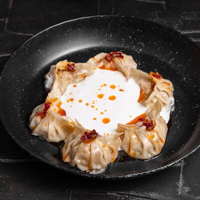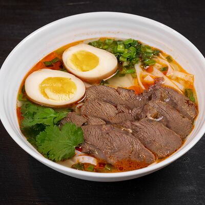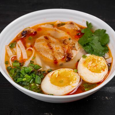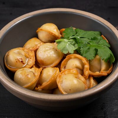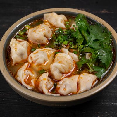 Наваристый бульон даши, пельмешки с говядиной, соус сингапурский, чеснок, имбирь, лук зеленый, кинза. Суп с остринкой. Подача блюд может отличаться от представленного