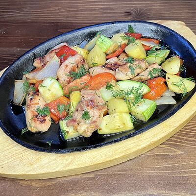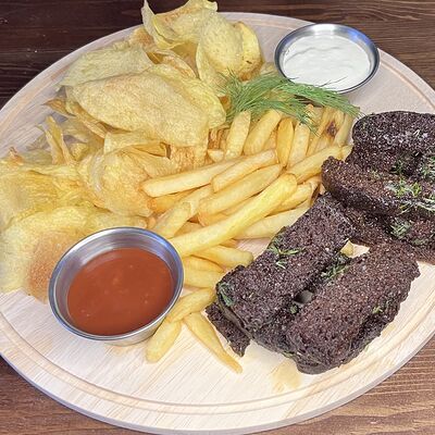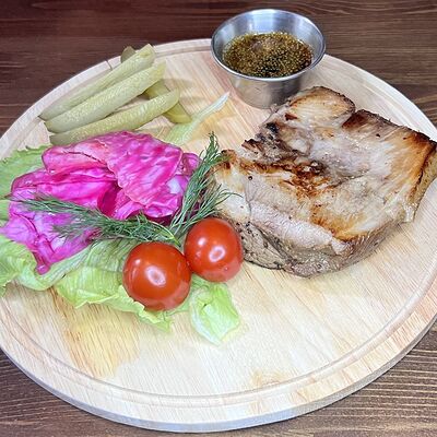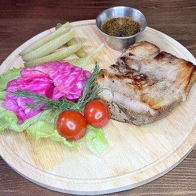 Подаются с печеным картофелем, маринованной капустой и кахетинским соусом