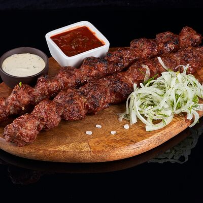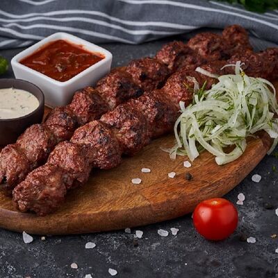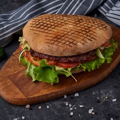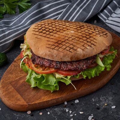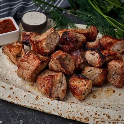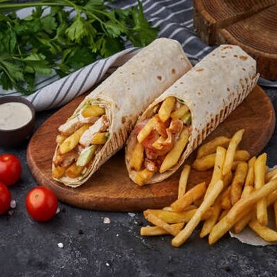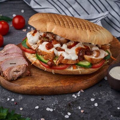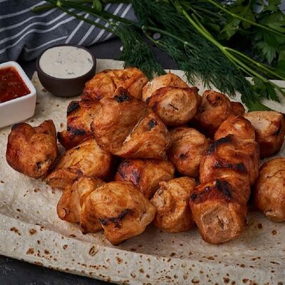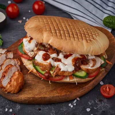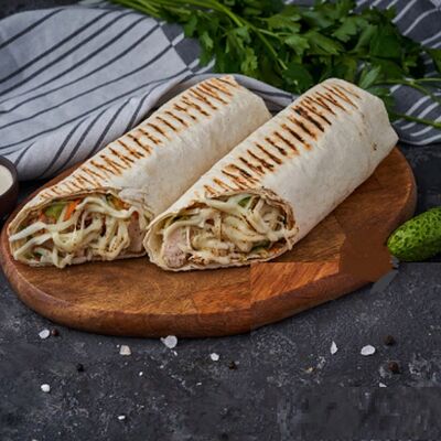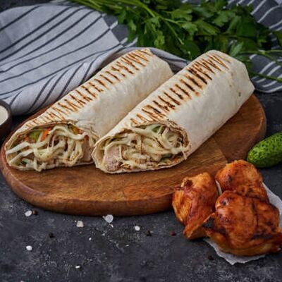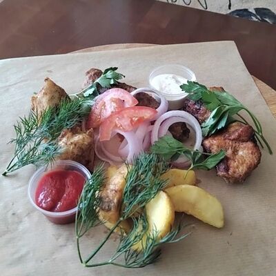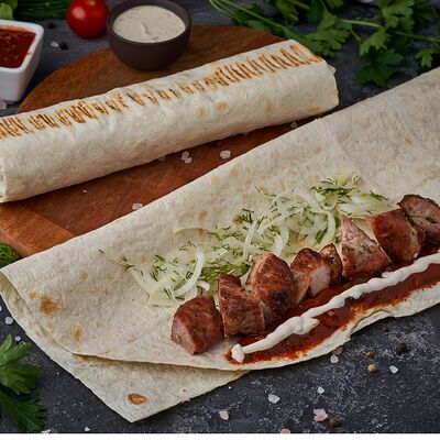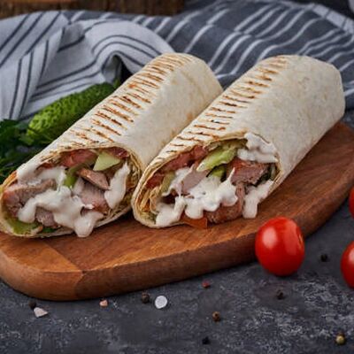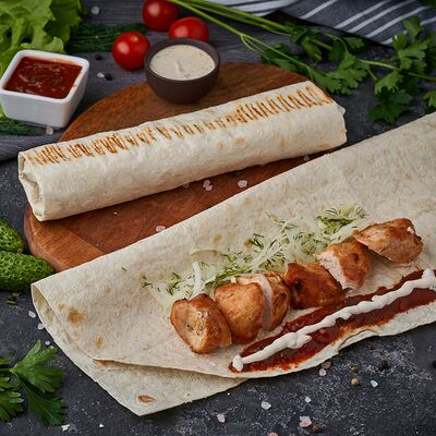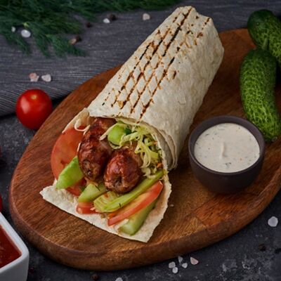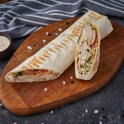 Филе куриной грудки, лук маринованный, соус по-кавказски, лаваш, подаётся в боксике