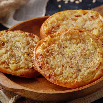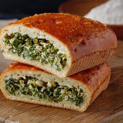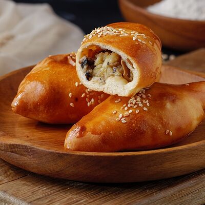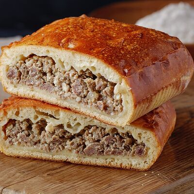 Тесто дрожжевое, фарш говяжий, фарш cвинoй, картофель, лук, соль специи