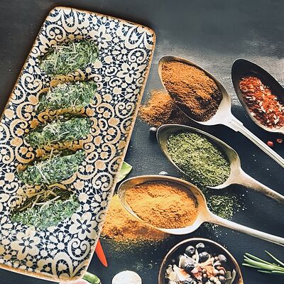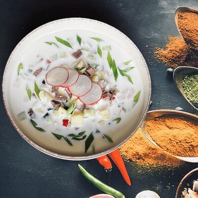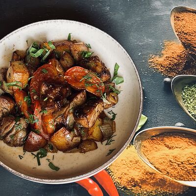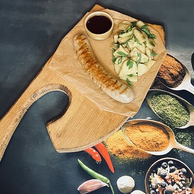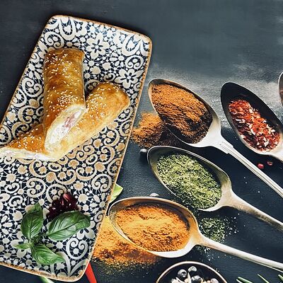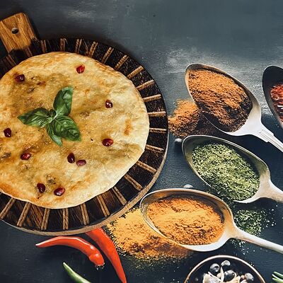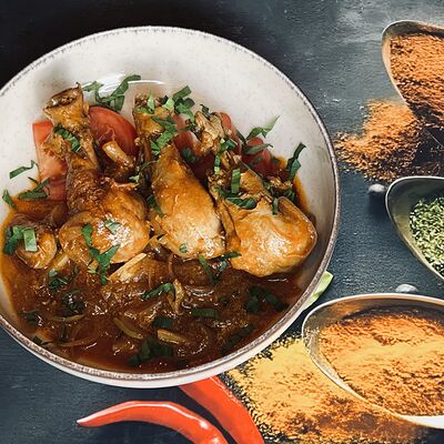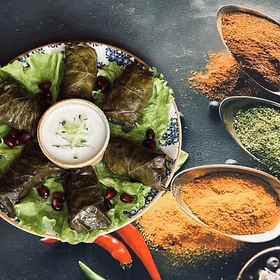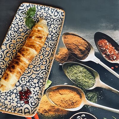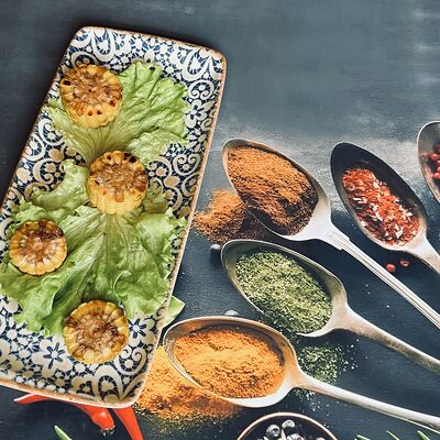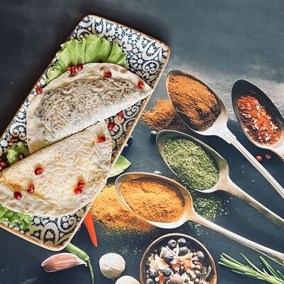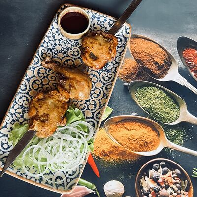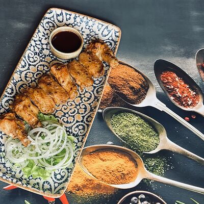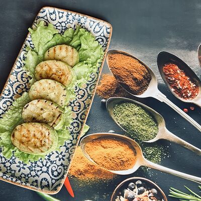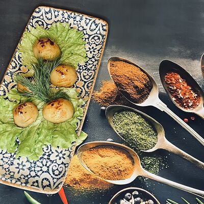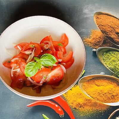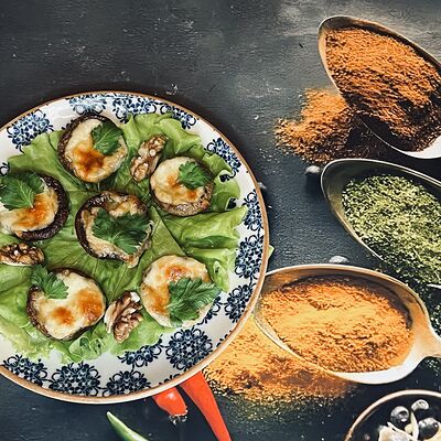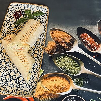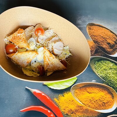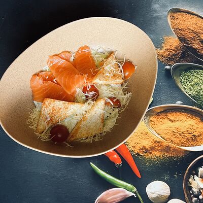 Салат айсберг, филе цыплёнка, соус цезарь, помидоры черри, сыр пармезан, яйцо перепелиное, крутоны